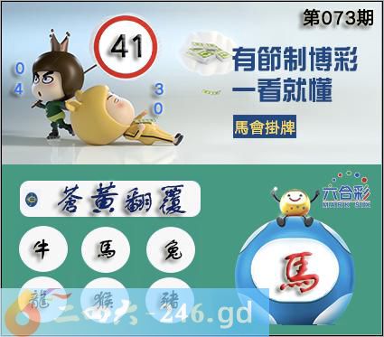 073期开奖时间2025年07月06(星期日)晚9:30开(农历六月十二鼠冲马) 生肖属性:丙子日;五行属性:火;地支六冲:鼠冲马,无虎;六合:牛;三合:猴龙。空亡肖:马狗。 六合不出:兔猪;三合不出:鼠龙马狗;应开生肖:鸡羊蛇狗龙。防:鸡虎兔 开奖日必开生肖鼠日:兔猪鼠龙马狗 开奖日日柱对应五行乙亥日:金火土 开奖日必开生肖乙亥:牛兔蛇鸡猪马 上期开鼠,必开:猪马鼠兔龙蛇 《073期》《《香港掛牌之全篇》》 073期正版彩图挂:41爆:马挂牌成语:苍黄翻复挂牌出肖:牛马兔龙猴猪 [释义]比喻变化不定,反复无常。 073期另版香港马会挂牌:40猴 073期马会挂牌22射3903 073期正版数码挂牌:07射:1236壹句真言:梅竹堂深歌吹动(23479) 073期蓝天玄挂牌:26牛 073期四柱《五味调和百味香》 073期藏寶圖新:碧海云峰二四六重老:到处随缘延岁月禁:蛇禁:4尾玄機字:《移》 073期跑狗:【令】箭矢穿身,執令無效。殘羽飄墜,孤誌難蘚。玄機測字:《軟》 073期香港关门联:头在天上脚落地,二五中来二三发。解[套][1627] 073期香港开门联:八月桂花万里香,本期要钱看绿红。解[底][8965] 073期另香港关门联:琴瑟谐和歌盛世,主意跟踪一和八解[雷][52476] 073期另香港开门联:身执金吾主禁兵,腰间宝剑重横行解[付][36019] 073期内部万花来料:万花开在双数博特看四六,蓝绿色彩尽显鼠藏狗居 073期台湾玄门挂牌:[宝至如归][069] 073期挂历诗:三通鼓角四更鸡,日色高升月低微。 073期火车头:烧伤狗。诗:羊死鸡伤,开过一门又一门。 073期火烧图解:火烧“蛇”。诗:面对三四联七来,横三直二在中间。 073期无字天书:八七九四三六来,二五得三并三数。牛21 073期最老版无字天书:二五得码三七跟,六二中特三九来。狗34 073期九宫禁肖:鼠 073期必中人物:鲁智深 073期二字经:成果 073期六合信箱紅字:秉燭待旦暗码:11193447 073期一語中特:三敎九流 073期挂牌绝杀料/挂牌绝杀:鸡 073期正版黄大仙射箭图:03射2037 073期另版黄大仙射箭图:12射4708 073期香港牌:[九字合一组][286] 073期内部运程曰:星辰北斗。配密码:{270} 073期香港信封挂牌:丈夫飘荡今如此(卯时上下)加5972 073期波段预测:05----1938--49 073期特码大小单双句:五味调和百味香解?? 073期特码大小单双句:日间寻食夜眼合解?? 073期铁算盘:天上飞舞海里住(一钩新月弄纤纤)开:? 073期香港版《香港六合天书挂牌》天书:狂蜂浪蝶皆成性,年华轻捐作何求。天码:03,05,12,13,21,35,37,44,49 073期(香港版)六合对联诗:横联:海誓山盟上联:二五焕彩九洲端下联:三八生辉四海春解:八。密码:382710 073期正版马会大门口挂牌一句话:本期四三并二到一九【挂46送18】开 073期另类马会大门口挂牌一句话:鼠牛猴马相遮天【马会送07】开 073期香港生活开门联:双龙抢宝宝出来,五哥有勢权贵知解[出][48761] 073期香港生活关门联:金屋藏娇定富贵,不是蛇头哭衰衰解[定][25260]