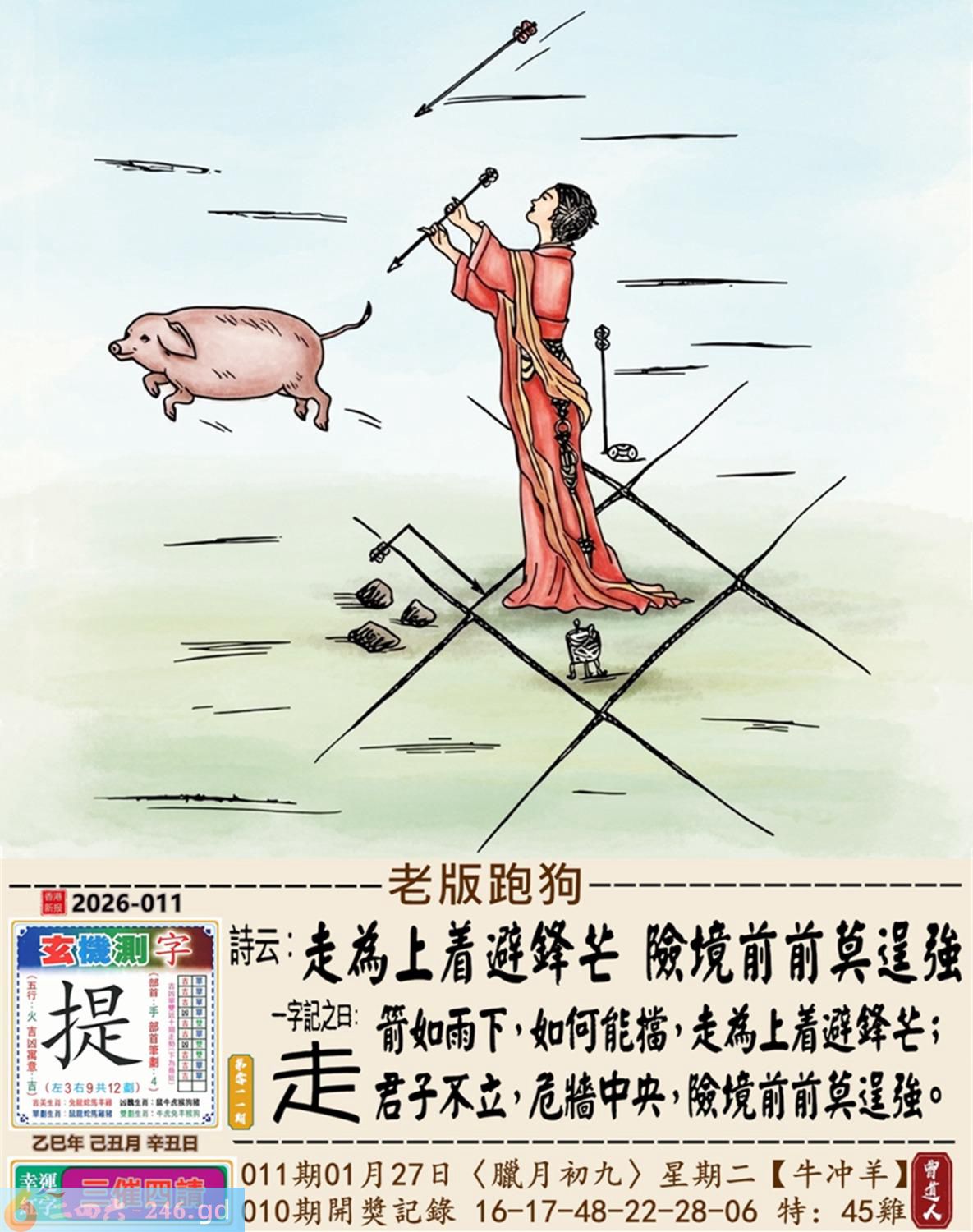 2026年1月27日011期羊(乙未)(壁上土) 011期:老版跑狗玄機一字記之曰:【走】 詩云:走為上着避鋒芒險境前前莫逞強 箭如雨下,如何能擋,走為上着避鋒芒; 君子不立,危牆中央,險境前前莫逞強。 玄機測字:《提》 密圖詩:酒足飯飽去按摩 《記》:同桌對座賽象棋 特碼大小單雙句:一窩鳥蛋有六個 今期必中:趙雲 011期:特碼歇后語 早上没刷牙-----嘴巴不干净 011期正版四字梅花诗:恕不奉陪。 011期火车头:烧伤龙。诗:鸡死猪伤,十二生肖排第四。 011期香港第一手欲钱料:龙? 011期曾道人说:“木?” 011期另版四字梅花诗:四面青山。 011期香港第一手欲钱料:欲钱找伶俐的动物。 011期曾道人说:“为什么每个人都比较喜欢钱呢”? 011期:二字經:好數 011期:电灯是特码 011期:智力金壤;一丝不挂 011期:信箱紅字:【急湍駛浪】 011期:【暗碼:05-31-39-46】 011期:一語中特:【九死一生】 發財玄機圖:冷静守候弓身嘶聲圖中明蛇紅綠 011期:藏寳圖 新:因想后湖题柱处 老:汉城黄柳映新帘 禁:虎禁:4尾玄机字《踌》 2026年011期【生活幽默】版 〖未來岳父〗 今天去女朋友家,心裏异常緊張。 晚上吃飯的時候,未来岳父多喝了兩杯,就跟我:"小李啊,我看你這人很有自信,胸懷寬廣,想必以後必成大器,女兒交給你我也就放心了。"聽得我那個高興,忙問這您也能看出來啊? 他回答道:"我瞧你長得這鳥樣,也敢泡我女兒,説明你這人不簡單。" 我......