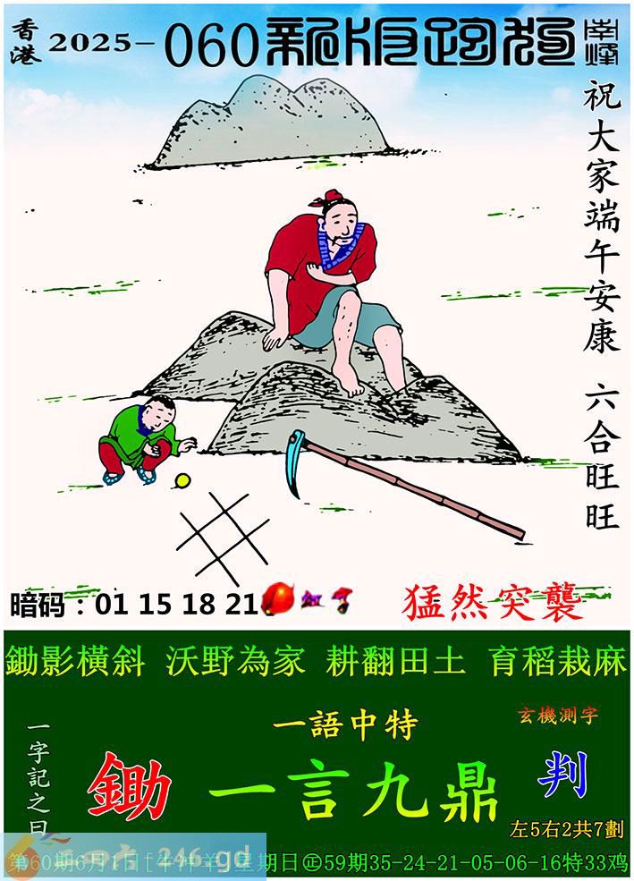 060期跑狗一字記之曰:【鋤】 鋤影橫斜,沃野為家。 耕翻田土,育稻栽麻。 玄機測字:《判》 一語中特:一言九鼎