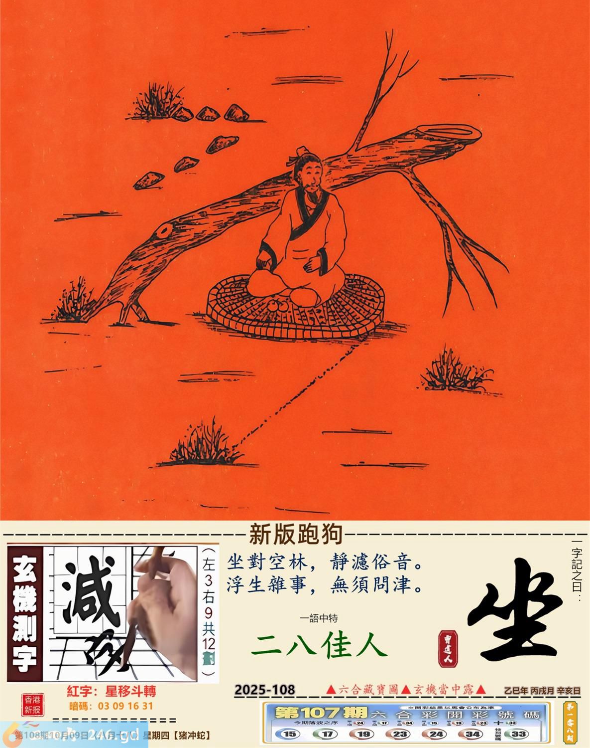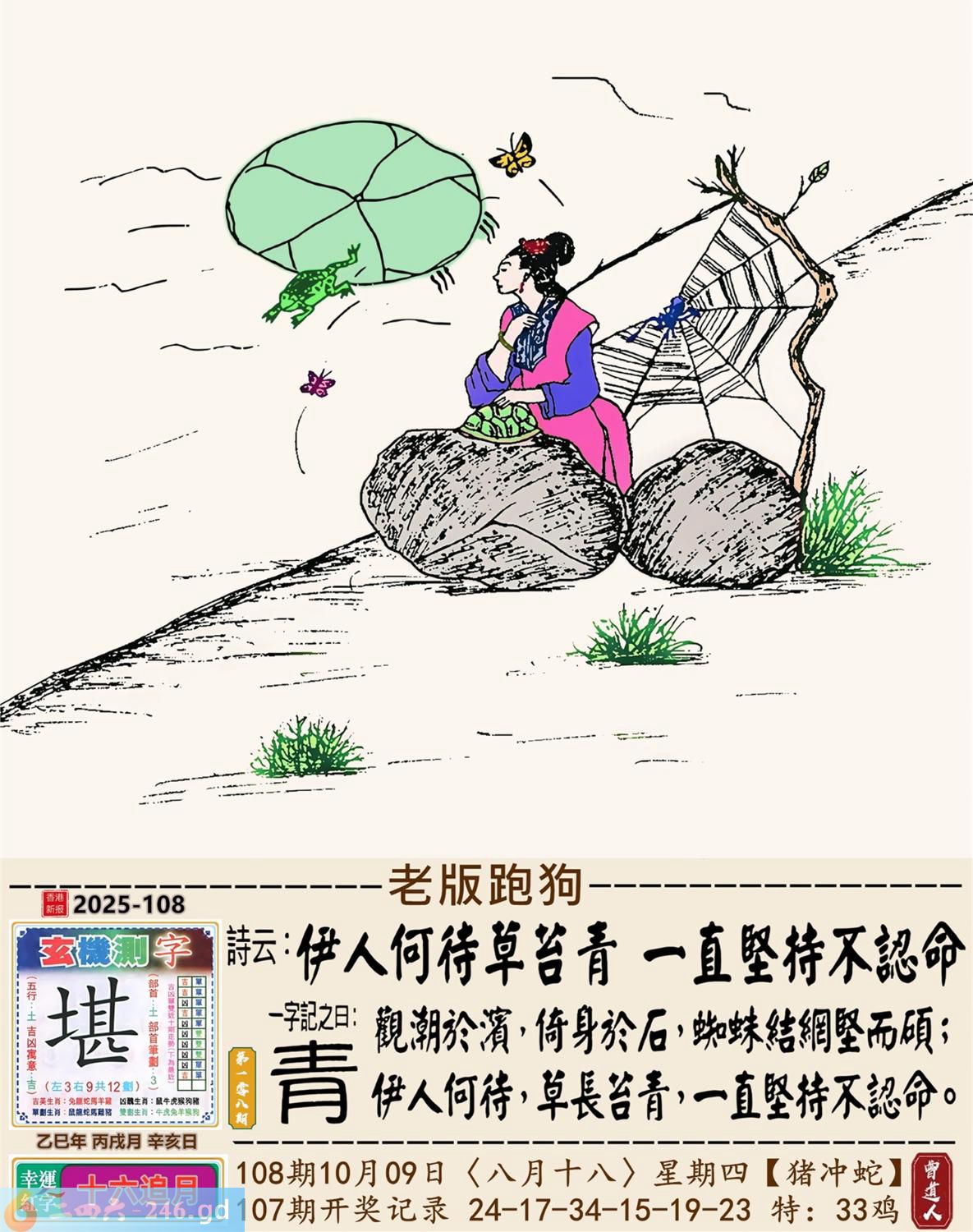 本帖最后由小歪于2025-10-821:50编辑 2025年10月9日108期蛇(乙巳)(钗钏金) 108期:老版跑狗玄機一字記之曰:【青】 詩云:伊人何待草苔青一直堅持不認命 觀潮於濱,倚身於石,蜘蛛結網堅而碩; 伊人何待,草長苔青,一直堅持不認命。 玄機測字:《堪》 密圖詩:打開大門迎財神 《記》:八仙過海顯蛇兔 特碼大小單雙句:天涯海角 今期必中:劉協 108期:特碼歇后語 膏药贴嘴巴-----难开口(号?) 108期正版四字梅花诗:齐头并进。 108期火车头:烧伤马。诗:猪死猴伤,一九三肖对一双。 108期香港第一手欲钱料:床前明月光。 108期曾道人说:“月亮?” 108期另版四字梅:三来三去。 108期香港第一手欲钱料:欲钱看世上好看的动物。 108期曾道人说:“女人二十耍酒疯是什么样的”? 108期:二字經:攻擊 108期:狗熊是特码 108期:智力金壤:黔驴技穷 108期:信箱紅字:【星移斗轉】 108期:【暗碼:03-09-16-31】 108期:一語中特:【二八佳人】 玄機發財圖:圖中明狗藍綠 108期:藏寳圖 新:云残香瘦春犹可 老:逢郎欲语低头笑 禁:虎禁:5尾玄機字《憧》 2025年108期【生活幽默】版 〖你有什么根據〗 夫婦倆坐小汽車,來到鄉裏,丈夫在開車,車子開了很久……。 突然,妻子問:“你不覺得我們迷路了嗎?” 丈夫:“你有什麽根據?我開車能力一直很好的。” 妻子:“你剛軋過去的那條死狗,我們半小時前已經軋過一次了。”