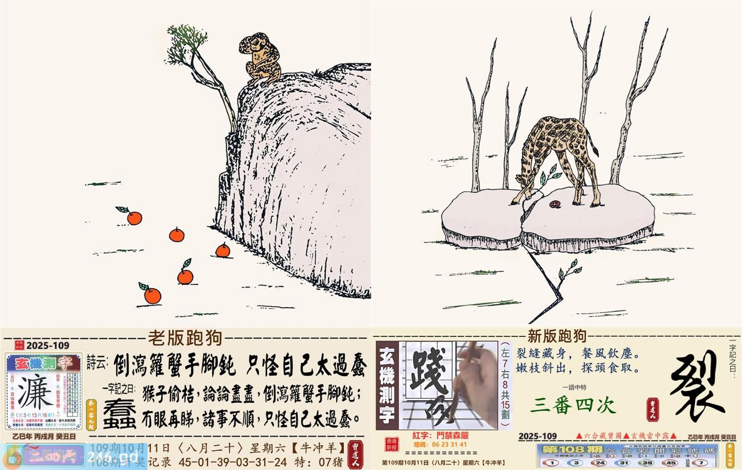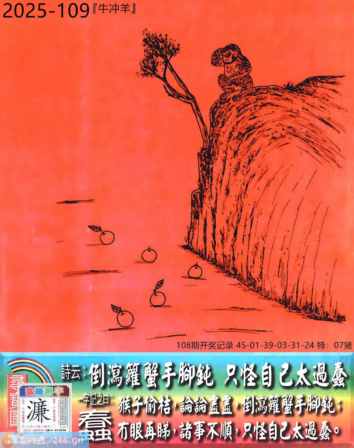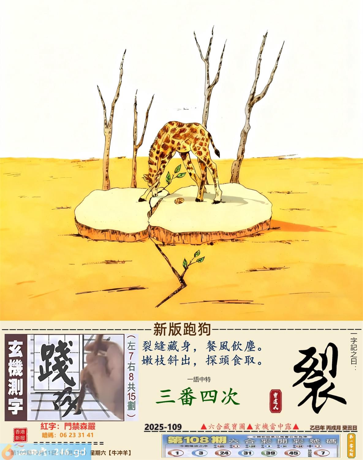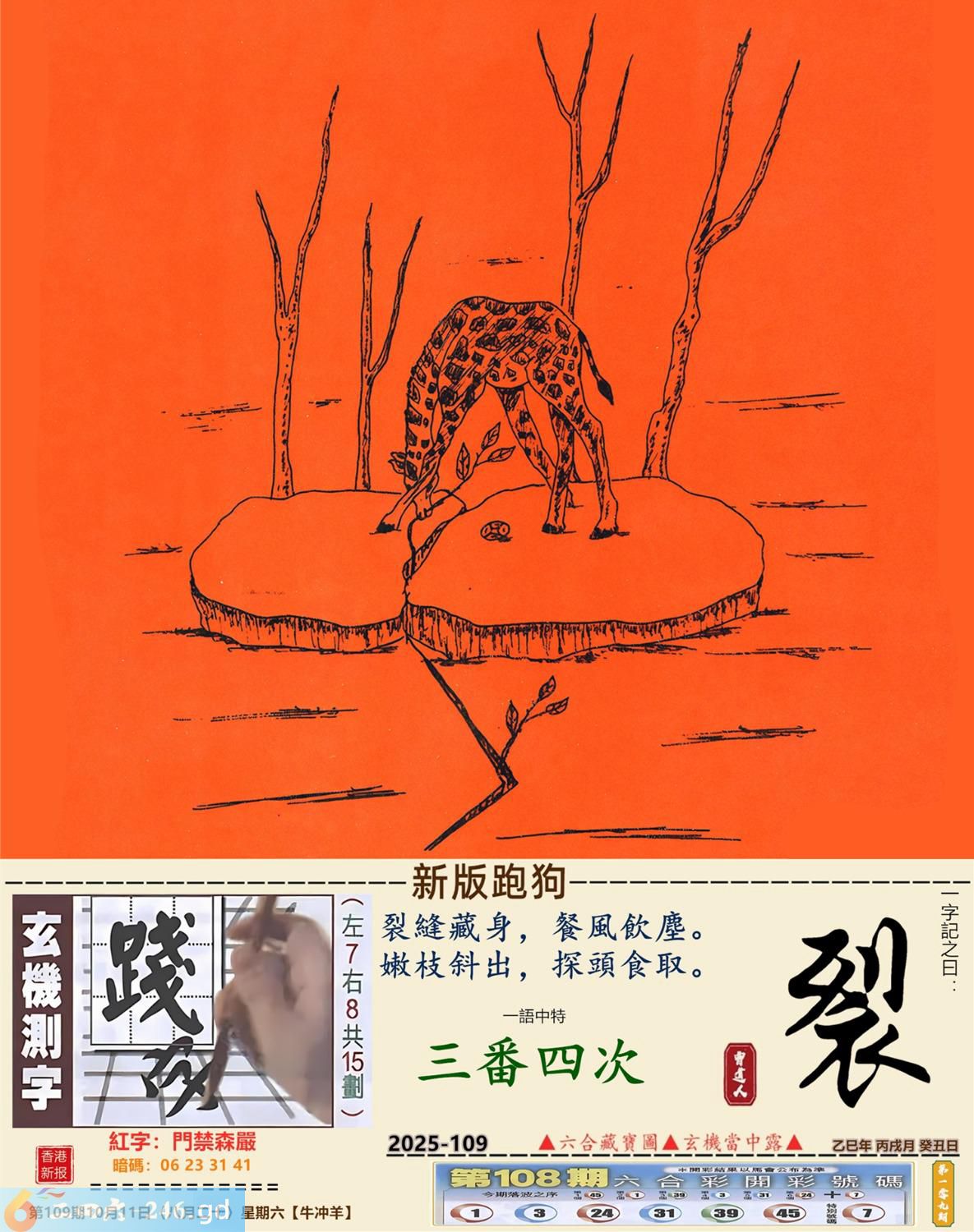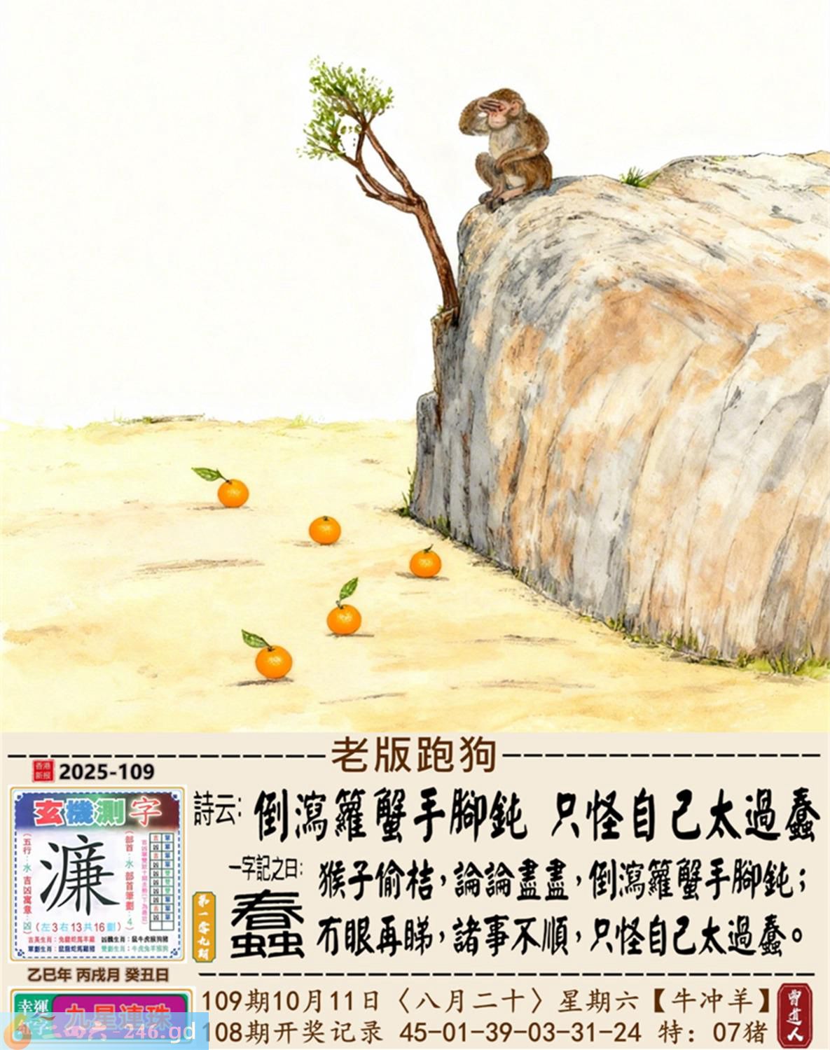 2025年10月11日109期羊(丁未)(桑松木) 109期:老版跑狗玄機一字記之曰:【蠢】 詩云:倒瀉籮蟹手腳鈍只怪自己太過蠢 猴子偷桔,論論盡盡,倒瀉罐蟹手腳鈍; 冇眼再睇,諸事不順,只怪自己太過蠢。 玄機測字:《濂》 密圖詩:有七有八出紅波 《記》:來回三局敗一地 特碼大小單雙句:非驢非馬 今期必中:趙雲 109期:特碼歇后語 钢精锅炒菜-----热得急,凉得快 109期正版四字梅花诗:有条不紊。 109期火车头:烧伤龙。诗:马死蛇伤,鸡猪伪装寻主生。 109期香港第一手欲钱料:西。 109期曾道人说:“左膀右臂?” 109期另版四字梅:远交近攻。 109期香港第一手欲钱料:欲钱到闹市坐一坐。 109期曾道人说:“为什么大妈大姐们都会喜欢跳广场舞呢”? 109期:二字經:走進 109期:鸭子是特码 109期:智力金壤:肝胆相照 109期:信箱紅字:【門禁森嚴】 109期:【暗碼:06-23-31-41】 109期:一語中特:【三番四次】 發財玄機圖:氣勢威猛儀態非凡圖中明龍紅藍 109期:藏寳圖 新:清坐闲披贝叶文 老:寻到溪源壹线初 禁:龙禁:6尾玄機字《收》 2025年109期【生活幽默】版 〖河裏洗澡〗 小時候和爸爸一起去河裹洗澡,開始我是拒绝下水的,老爸説有他在没事,老爸在前面試着水的深淺,我小心翼翼的緊跟其後。突然脚下一滑,我立馬抱着老爸的大腿,老爸用力一甩,把我甩了好遠,河水喝的飽飽的。老爸把我捞起之後,拍着胸脯說:你嚇死我了,我以爲有水鬼拉我腿呢。