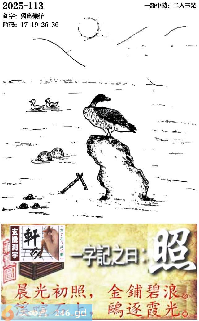 113期跑狗一字記之曰:【照】 晨光初照,金鋪碧浪。 溪喧石上,鷗逐霞光。 玄機測字:《軒》 一語中特:二人三足