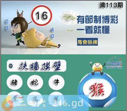 113期正版彩图挂:16 爆:猴 挂牌成语:扶墙摸壁 挂牌出肖:猪蛇牛虎马羊