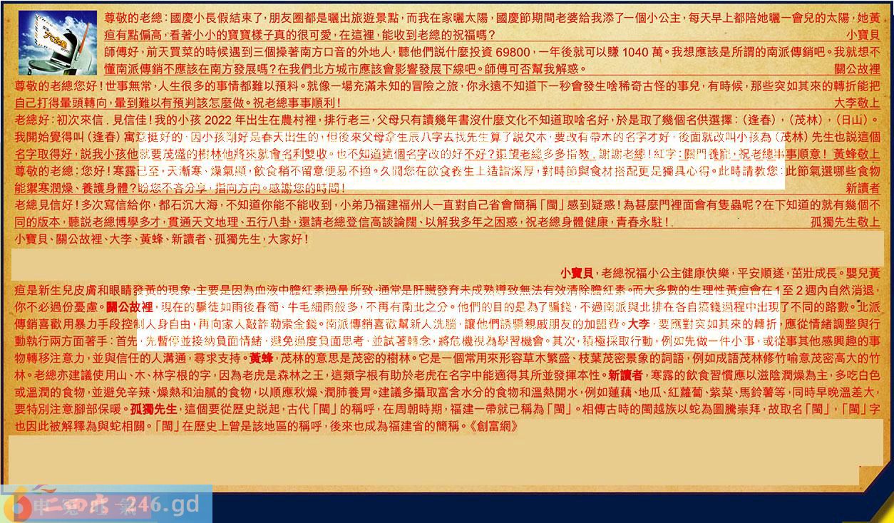 第116期《六合皇信箱文字版》10000%正確!!!正版二四六論壇*精心製作!!! 小寶貝、關公故裡、大李、黃蜂、新讀者、孤獨先生,大家好! 【1】.尊敬的老總:國慶小長假結束了,朋友圈都是曬出旅遊景點,而我在家曬太陽,國慶節期間老婆給我添了一個小公主,每天早上都陪她曬一會兒的太陽,她黃疸有點偏高,看著小小的寶寶樣子真的很可愛,在這裡,能收到老總的祝福嗎?小寶貝 〖小寶貝〗:老總祝福小公主健康快樂,平安順遂,茁壯成長。嬰兒黃疸是新生兒皮膚和眼睛發黃的現象,主要是因為血液中膽紅素過量所致,通常是肝臟發育未成熟導致無法有效清除膽紅素。而大多數的生理性黃疸會在1至2週內自然消退,你不必過份憂慮。 【2】.師傅好,前天買菜的時候遇到三個操著南方口音的外地人,聽他們說什麼投資69800,一年後就可以賺1040萬。我想應該是所謂的南派傳銷吧。我就想不懂南派傳銷不應該在南方發展嗎?在我們北方城市應該會影響發展下線吧。師傅可否幫我解惑。關公故裡 〖關公故裡〗:現在的騙徒如雨後春筍、牛毛細雨般多,不再有南北之分。他們的目的是為了騙錢,不過南派與北排在各自搞錢過程中出現了不同的路數。北派傳銷喜歡用暴力手段控制人身自由,再向家人敲詐勒索金錢。南派傳銷喜歡幫新人洗腦,讓他們誘騙親戚朋友的加盟費。 【3】.尊敬的老總您好!世事無常,人生很多的事情都難以預料。就像場充滿未知的冒險之旅,你永遠不知道下一秒會發生啥稀奇古怪的事兒,有時候,那些突如其來的轉折能把自己打得暈頭轉向,量到難以有預判該怎麼做。祝老總事事順利!大李敬上 〖大李〗:要應對突如其來的轉折,應從情緒調整與行動執行兩方面著手:首先,先暫停並接納負面情緒,避免過度負面思考,並試著轉念,將危機視為學習機會。其次,積極採取行動,例如先做一件小事或從事其他感興趣的事物轉移注意力,並與信任的人溝通,尋求支持。 【4】.老總好:初次來信.見信佳!我的小孩2022年出生在農村裡,排行老三,父母只有讀幾年書沒什麼文化不知道取啥名好,於是取了幾個名供選擇:(逢春),(茂林),(日山)。我開始覺得叫(逢春)寓意挺好的,因小孩剛好是春天出生的但後來父母拿生辰八字去找先生算了說欠木,要改有帶木的名字才好,後面就改叫小孩為(茂林)先生也說這個名字取得好,說我小孩他就要茂盛的樹林他將來就會名利雙收。也不知道這個名字改的好不好?還望老總多多指教,謝謝老總!紅字:關門養寵,祝老總事事順意!黄蜂敬上 〖黃蜂〗:茂林的意思是茂密的樹林。它是一個常用來形容草木繁盛、枝葉茂密景象的詞語,例如成語茂林修竹喻意茂密高大的竹林。老總亦建議使用山、木、林字根的字,因為老虎是森林之王,這類字根有助於老虎在名字中能適得其所並發揮本性。 【5】.尊敬的老總:您好!寒露已至天漸寒、燥氣顯,飲食稍不留意便易不適。久聞您在飲食養生上造詣深厚,對時節與食材搭配更是獨具心得。此時請教您:此節氣選哪些食物能禦寒潤燥、養護身體?盼您不吝分享,指向方向。感謝您的時間!新讀者 〖新讀者〗:寒露的飲食習慣應以滋陰潤燥為主,多吃白色或溫潤的食物,並避免辛辣、燥熱和油腻的食物,以順應秋燥潤肺養胃。建議多攝取富含水分的食物和溫熱開水,例如蓮藕、地瓜、紅蘿蔔、紫菜、馬鈴薯等,同時早晚溫差大,要特別注意腳部保暖。 【6】.老總見信好!多次寫信給你,都石沉大海,不知道你能不能收到,小弟乃福建福州人一直對自己省會簡稱「閩」感到疑惑!為甚麼門裡面會有售蟲呢?在下知道的就有幾個不同的版本,聽說老總博學多才,貫通天文地理、五行八卦,還請老總登信高談論闊、以解我多年之困惑,祝老總身體健康,青春永駐!孤獨先生敬上 〖孤獨先生〗:這個要從歷史說起,古代「閩」的稱呼,在周朝時期,福一帶就已稱為「閩」。相傳古時的閩越族以蛇為圖騰崇拜,故取名「閩」,「閩」字也因此被解釋為與蛇相關。「閩」在歷史上曾是該地區的稱呼,後來也成為福建省的簡稱。 紅字:申冤吐氣 暗码:06151921 [释义]洗雪冤屈,发泄怨恨。