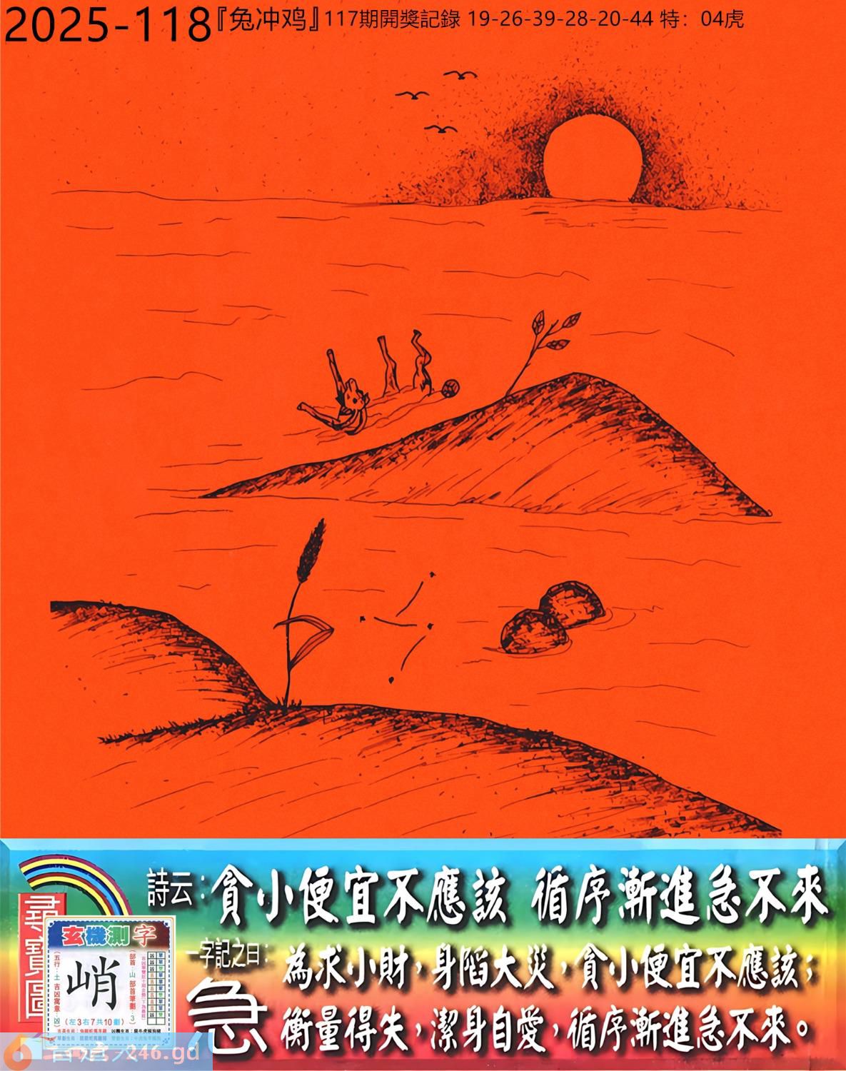 2025年11月6日118期鸡(癸酉)(城墙土) 118期:老版跑狗玄機一字記之曰:【急】 诗云:貪小便宜不應該循序漸進急不來 為求小財,身陷大災,貪小便宜不應該; 衡量得失,潔身自愛,循序漸進急不來。 玄机测字:《峭》 密圖詩:一臉蒙逼買三四 《記》:八面來風臘月會 特碼大小單雙句:小小買注二十塊 今期必中:馬岱 118期:特碼歇后語 饿着肚子造反-----借机(饥)闹事 118期正版四字梅花诗:一丝不挂。 118期火车头:烧伤马。诗:猪死猴伤,绿波今期有特码。 118期香港第一手欲钱料:暗淡无光。 118期曾道人说:“春暖花开?” 118期另版四字梅花诗:羊入虎口。 118期香港第一手欲钱料:欲钱看飞机。 118期曾道人说:“为什么英雄爱美人呢”? 118期:二字經:七碼 118期:轮船是特码 118期:智力金壤:无为而治 118期:信箱紅字:【梧桐斷角】 118期:【暗碼:24-31-36-38】 118期:一語中特:【三五成群】 發財玄機圖:神通廣大雷電交加圖中明龍紅綠 118期:藏寳圖 新:苏小门前万缕垂 老:伴人东去到江城 禁:羊禁:5尾玄機字《存》 2025年118期【生活幽默】版 〖用中文怎么說〗 有個外國學生初學中文,十分吃力。 有一天,老師問他:“如果我想讓某人到這邊來,用中文怎麼説?” 這外國學生一字一頓地説:“這邊請。”老師聽了滿意地點了點頭:“那麽,如果我想讓某人出去,用中文又要怎麼說?" 衹見外國學生走到外面,然後對老師說:‘這邊請’。”