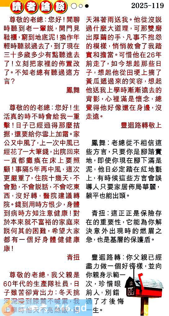 第一一九期讀者論談 1.尊敬的老總:您好!閒聊時聽到老一輩說,開門見鞋櫃窮到地底泥!換作年輕時聽就過去了,到了現在三十多歲多少有點聽進去了!立刻把家裡的佈置改了。不知老總有聽過這方言?鳳舞 〖鳳舞〗:老總從不相信這些方言,只要你是腳踏實地,即使你現在腳下滿是泥,他日必定踏在紅地氈上,有時候這些方言會誤導人只要家居佈局華麗,躺平也能出頭。 2.尊敬的的老總:您好!生活真的時不時會給我一重擊!日子已經過得那麼拮据,還要給你雪上加霜。家公又中風了,上一次中風已經花了一大筆錢,出院回來一直都癱瘓在床上要照顧!事隔5年再中風,這次更嚴重了,住院十幾天,不會動,不會說話,不會吃東西,沒好轉,醫院建議轉院。錢到用時方恨少,身體到病時方知注意健康!對於本來就不富裕的家庭來說何其的困難,希望大家都有一個好身體健健康康!青扭 〖青扭〗:這正正是保險存在的重要性,它能為你解決意外出現時的燃眉之急,也是基層的保護盾。 3.尊敬的老總,我父親是60年代的生產隊社員,日子雖苦卻肯出力:冬天挑河泥浸到膝蓋不喊累,我上學時他天不亮熱飯、雨天淋著雨送我。他從沒說過什麼大道理,可那雙磨出厚繭的手、凡事不抱怨的模樣,悄悄教會了我踏實和擔當。可惜他在26年前走了,如今想起那些日子,想起他從田埂上摘了黃瓜遞過來的笑容,想起他送我上學時漸漸遠去的背影,心裡滿是懷念,總覺得他好像還在身邊,沒走遠。豐迴路轉敬上 〖豐迴路轉〗:你父親已經盡力做一個好镑樣,並向你親身示範一次,珍惜眼前人,別錯過了才後悔一生。