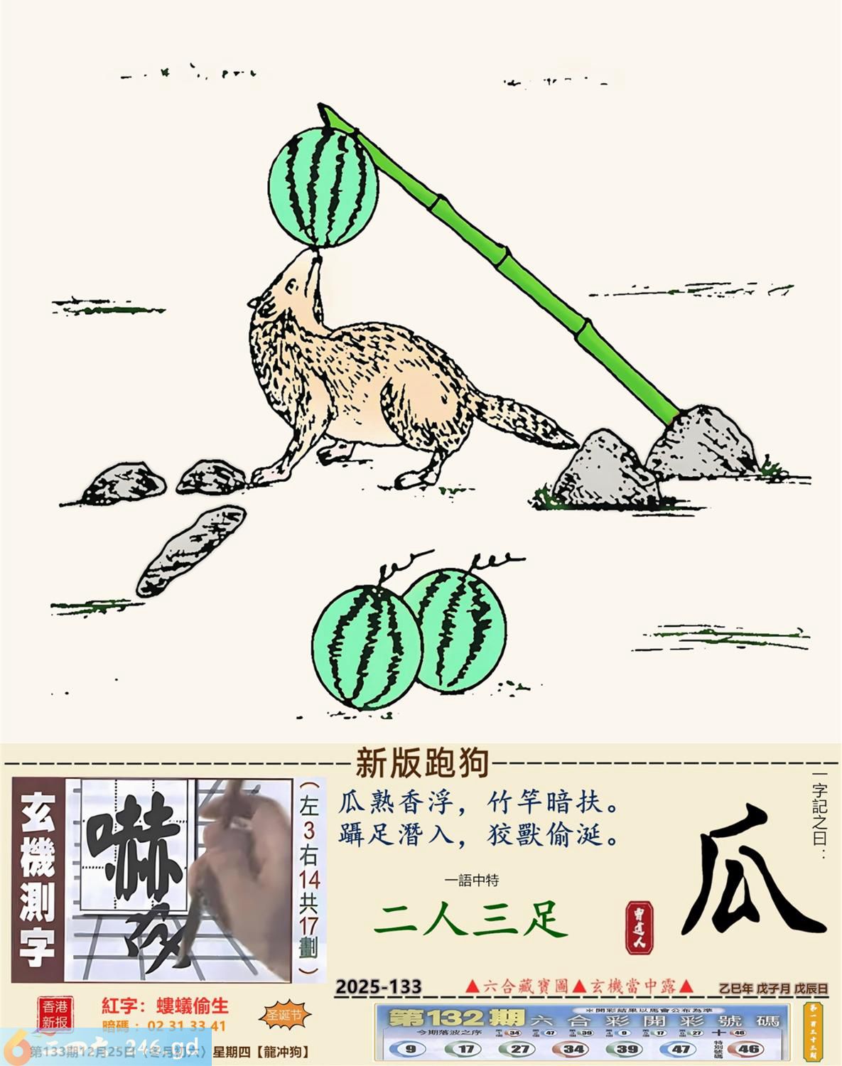 2025年12月25日133期狗(壬戌)(大林木) 133期:老版跑狗玄機一字記之曰:【財】 詩雲:金銀財帛隨時有生活富足不用愁 順藤摸錢,橫財就手,金銀財帛隨時有; 時來運到,鴻運當頭,生活富足不用愁。 玄機測字:《吼》 密圖詩:三個和尚沒水喝 《記》:一江春水向東流 特碼大小單雙句:八戒戲嫦娥 今期必中:張飛 133期:特碼歇后語 尿壶打掉把儿-----光剩一张嘴 133期正版四字梅花诗:高不可攀。 133期火车头:烧伤马。诗:龙死兔伤,四六分明把数算。 133期香港第一手欲钱料:牛。 133期曾道人说:“随遇而安?” 133期另版四字梅花诗:穷意识就。 133期香港第一手欲钱料:欲钱看西游记第二回。 133期曾道人说:“男人三十喝酒时喜欢做什么事”? 133期:二字經:看頭 133期:皇帝是特码 133期:智力金壤:一丘之貉 133期:信箱紅字:【螻蟻偷生】 133期:【暗碼:02-31-33-41】 133期:一語中特:【二人三足】 發財玄機圖:雄才大略氣慨威武圖中明龍紅綠 133期:藏寳圖 新:斗牛不神箕独灵 老:轻舸帷恐东下迟 禁:牛禁:0尾玄機字《弦》 2025年133期【生活幽默】版 〖在公厠裏〗 在公厕裏,忽然聽到間有人説話:"哥們兒,有手纸嗎?" 我翻了翻口袋:"抱歉,没有。" 過了幾秒鐘,那人又問:"那有小塊報纸嗎?"我無奈地一笑:"對不起,没有,我祗是來小便的。" 又過了幾秒鐘,間門縫塞出一張10元人民幣:"能幫我换成1塊錢的嗎?" 我把錢遞過去,間裏傅來一聲咆哮:"你别給我十個硬幣啊!"