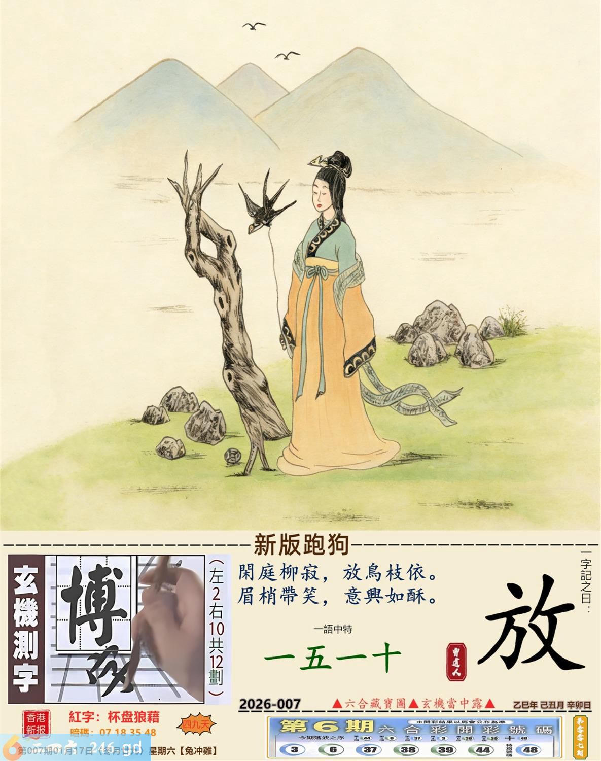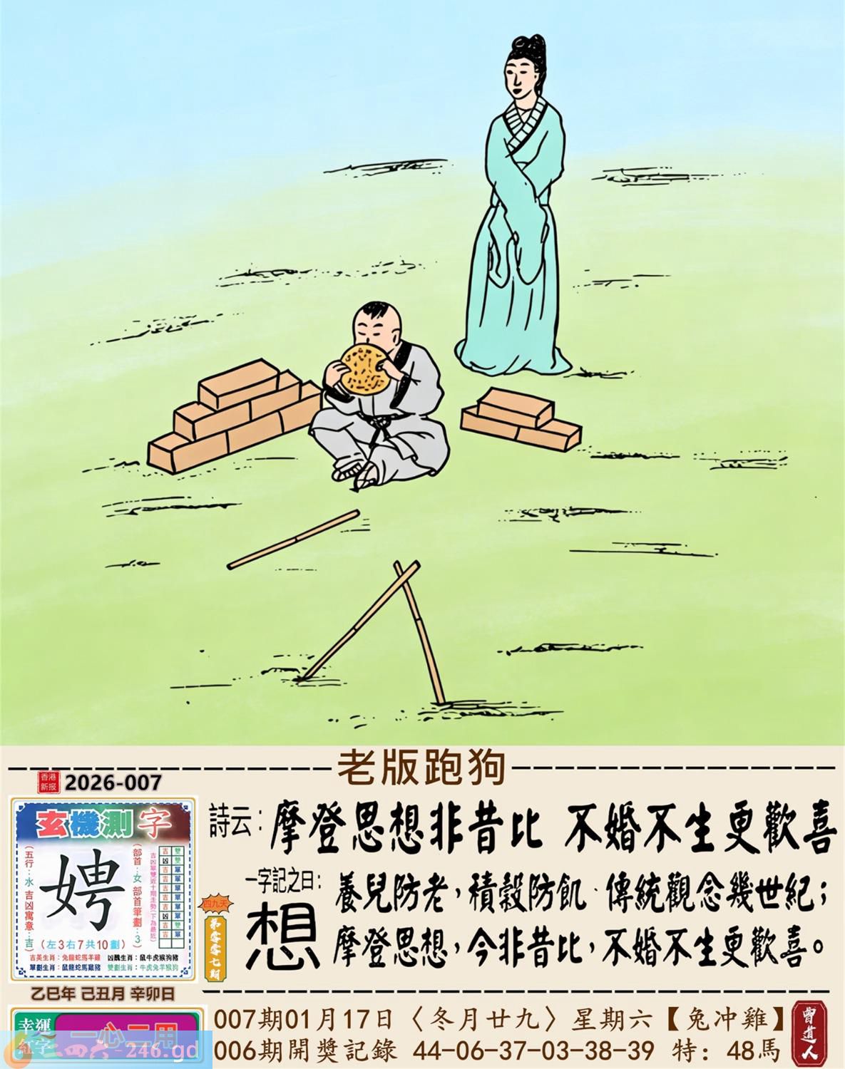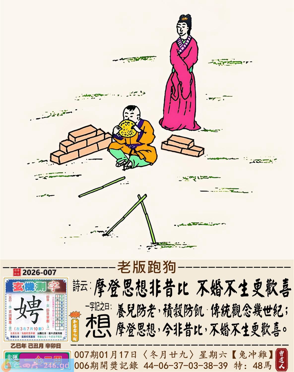 2026年1月17日007期鸡(乙酉)(松柏木) 007期:老版跑狗玄機一字記之曰:【想】 詩云:摩登思想非昔比不婚不生更歡喜 養兒防老,積榖防飢,傳統觀念幾世紀; 摩登思想,今非昔比,不婚不生更歡喜。 玄機測字:《娉》 密圖詩:左邊不是右邊是 《記》:山上拾柴烤兔子 特碼大小單雙句:一腳登天是神仙 今期必中:孫尚香 007期:特碼歇后語 混进狗群的狼-----藏头藏尾 0007期正版四字梅花诗:旗鼓相当。 007期火车头:烧伤兔。诗:虎死牛伤,一蛇延愿十里长。 007期香港第一手欲钱料:单?。 007期曾道人说:“双?” 007期另版四字梅花诗:三长两短。 007期香港第一手欲钱料:欲钱找中国茅台酒。 007期曾道人说:“为什么女人爱烫发”? 007期:二字經:七八 007期:狗官是特码 007期:智力金壤;庖丁解牛 007期:信箱紅字:【杯盘狼藉】 007期:【暗碼:01-18-20-41】 007期:一語中特:【一五一十】 發財玄機圖:歡蹦亂跳小巧玲瓏圖中明羊紅綠 007期:藏寳圖 新:已陪沁水追欢日 老:少小虽非投笔吏 禁:猪禁:2尾玄机字《空》 2026年007期【生活幽默】版 〖醉酒后〗 一般人在酒醉之後有的會酒後亂性,有的則會説出真心話...... 何先生在睡前喝一點酒之後,覺得頭腦發暈,先去睡覺。 睡到半夜何先生突然起床趕緊穿好襯衫,褲子。 "你半夜起床穿衣服幹嘛要去哪?"何太太莫名奇妙地間。 "我要趕快回家去。"何先生很本能地回答。