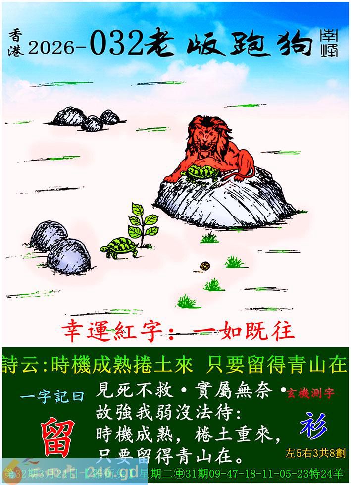 032期老版跑狗一字記之曰:【留】 詩雲:時機成熟捲土來,只要留得青山在。