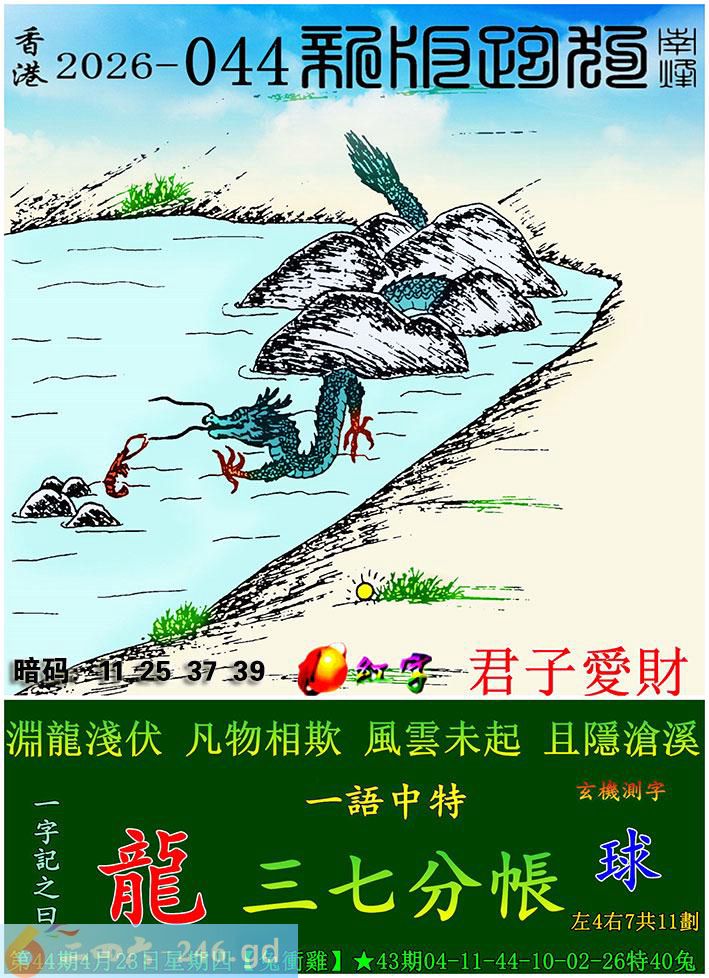 044期跑狗一字記之曰:【龍】 淵龍淺伏,凡物相欺。 風雲未起,且隱滄溪。
