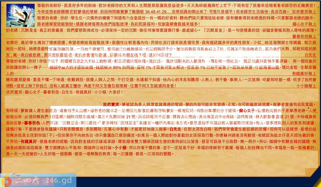 【1】.尊敬的老師好,我是你多年的粉絲,對於老師你的文采和人生閱歷那是讓我受益彼多。天天為碎銀幾兩忙上忙下,下班有空了就會來信箱看看老師您的玄機奧密!今來信想老師聽聽您對夢境的理解,前段時間睡覺夢了幾個號36.48.41.29....沒想到真的開出來了,可惜只是個平!祝老師您生活愉快,長命百歲。淡然壹笑敬上