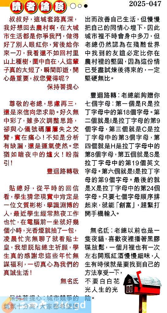 第零四七期讀者論談 1.叔叔好,這城套路真深,我好想回去農村啊,在大城市生活都是你爭我鬥,做得好了別人眼紅你,背後給你來刀,我看還不如回村里山上種樹,圖中自在,人這輩子真的太短了,瞬間即逝,開心最重要,叔您覺得呢?保持菩提心 〖保持菩提心〗:城市競爭的氣氛十分高,大家都希望跑出而改善自己生活,但慢慢把自己的同情心埋下,因此城市裡不時會身中多刀,但老總仍然認為在殘酷世界中找到的友誼必定比你在農村裡的堅固,因為這份情已受盡試煉後得來的,一定堅硬無比。 2.尊敬的老總,思慮再三,還是來信向您求助。好久無中彩了,雖多次調整思路卻與心儀號碼屢屢失之交臂,實在痛心!不知是分析有缺漏,還是運氣使然。您猶如暗夜中的爐火!盼指引!豐迴路轉敬 〖豐迴路轉〗:老總能夠贈你七個字母:第一個是是拉丁字母中的第18個字母。第二個就是是拉丁字母的第9個字母,第三個就是是拉丁字母中的第3個字母,第四個就是是拉丁字母中的第8個字母,第五個就是是拉丁字母中的第19個英文字母。第六個就是是拉丁字母的第9個字母。最後的就是是拉丁字母中的第24個字母。只要七個字母順序排起來,就能「創富」,趕緊打開手機輸入。 3.貼總好,從平時的回信看學生猜您現實中肯定是一位文質彬彬,學識淵博的人,最近學生經常熬夜工作也忙,在電腦前一坐就好幾個小時,光香煙就抽了一包凌晨忙完無聊了就看貼士皇,我想說貼總主祈願,學生真的感謝您這些年忙無謀福利,一切真心為我們的真誠生活!無名氐 〖無名氏〗:老總以前也是一隻夜貓,喜歡夜裡播著黑膠碟放鬆,一個月裡也有一次左右開瓶紅酒慢慢細味,人生有時候就是要找到自己的方法享受一下,不要白白花光人生的光陰。