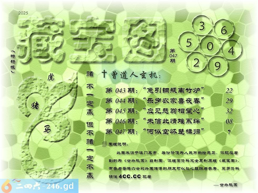 047期藏寶圖 新:何似空怀楚橘归 老:翠柳轻风春色流 禁:狗禁:7尾玄機字:《光》