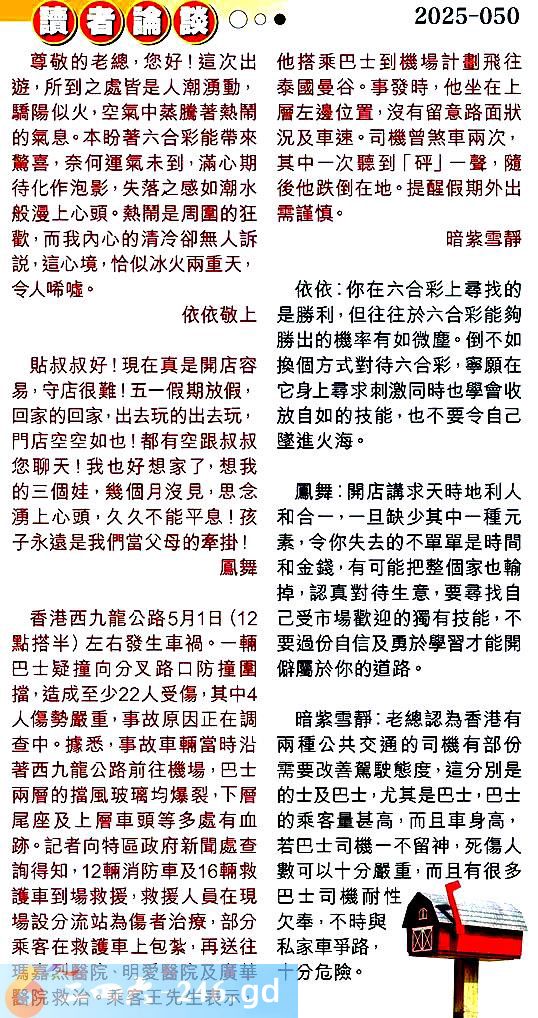 第零五零期讀者論談 1.尊敬的老總,您好!這次出遊,所到之處皆是人潮湧動,驕陽似火,空氣中蒸騰著熱鬧的氣息。本盼著六合彩能帶來驚喜,奈何運氣未到,滿心期待化作泡影,失落之感如潮水般漫上心頭。熱鬧是周圍的狂歡,而我內心的清冷卻無人訴說,這心境,恰似冰火兩重天,令人唏噓。依依敬上 〖依依〗:你在六合彩上尋找的是勝利,但往往於六合彩能夠勝出的機率有如微塵。倒不如換個方式對待六合彩,寧願在它身上尋求刺激同時也學會收放自如的技能,也不要令自己墜進火海。 2.貼叔叔好!現在真是開店容易,守店很難!五一假期放假回家的回家,出去玩的出去玩門店空空如也!都有空跟叔叔您聊天!我也好想家了,想我的三個娃,幾個月沒見,思念湧上心頭,久久不能平息!孩子永遠是我們當父母的牽掛!鳳舞 〖鳳舞〗:開店講求天時地利人和合一,一且缺少其中一種元素,令你失去的不單單是時間和金錢,有可能把整個家也輸掉,認真對待生意,要尋找自己受市場歡迎的獨有技能,不要過份自信及勇於學習才能開僻屬於你的道路。 3.香港西九龍公路5月1日(12點搭半)左右發生車禍。一輛巴士疑撞向分叉路口防撞圍擋,造成至少22人受傷,其中4人傷勢嚴重,事故原因正在調查中。據悉事故車輛當時沿著西九龍公路前往機場,巴士兩層的擋風玻璃均爆裂,下層尾座及上層車頭等多處有血跡。記者向特區政府新聞處查詢得知,12輛消防車及16輛救護車到場救援,救援人員在現場設分流站為傷者治療,部分乘客在救護車上包紮,再送往瑪嘉烈醫院、明愛醫院及廣華醫院救治。乘客王先生表示,他搭乘巴土到機場計劃飛往泰國曼谷。事發時,他坐在上,層左邊位置,沒有留意路面狀況及車速。司機曾煞車兩次,其中一次聽到「砰」一聲,随後他跌倒在地。提醒假期外出需謹慎。暗紫雪靜 〖暗紫雪靜〗:老總認為香港有兩種公共交通的司機有部份需要改善駕駛態度,這分别是的士及巴士,尤其是巴士,巴士的乘客量甚高,而且車身高,若巴士司機不留神,死傷人數可以十分嚴重,而且有很多巴士司機耐性欠奉,不時與私家車爭路十分危險。