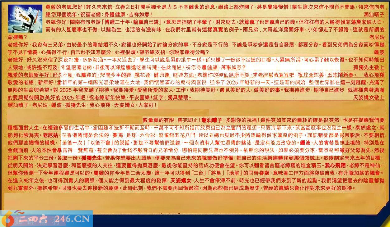 第023期《六合皇信箱文字版》10000%正確!!!正版二四六論壇*精心製作!!! 潮汕晴子、老尼姑、鍾波、孤獨先生、我心飛翔、天姿嬌女,大家好! 【1】.尊敬的老總您好!許久未來信,立春之日打開手機全是大不幸離世的消息,網路上都炸開了,甚是覺得惋惜!學生這次來信不問肖不問馬,特來信向老總您拜個晚年,祝福老總:身體健康,吉祥如意!潮汕晴子 〖潮汕晴子〗:多謝你的祝福!這件突如其來的噩耗的確是很突然,也是在提醒我們要積極面對人生。在複雜多變的生活中,當困難和挫折不期而至時,千萬不可不知所措而放棄自己為之奮鬥的理想。只要冷靜下來就當甚麼事也沒發生一樣,泰然處之,就能夠化險為夷。 【2】.老總你好!閩南有老話「博繳三十年,輸贏自己錢」。意思是指賭了半辈子,財來財去,就算赢了也是赢自己的錢。但往往有的人輸得傾家蕩產家破人亡,而有的人甚麼事也不做,以賭為生,也活的有滋有味,在我們村里就有這樣真實的例子。兩兄弟,大哥起洋房開好車,小弟卻走了不歸路。這就是所謂的命運嗎?老尼姑 〖老尼姑〗:在香港賭博是合法的,賽馬、足球、六合彩、麻雀館五花八門,所以老總也見過不少賭徒輸得傾家蕩產的例子。謹記賭徒都是影帝影后,不要相信他們那些懊悔的模樣,「最後一次」「以後不會」的說話,更加不要幫他們還錢,一個永遠有人幫忙還債的賭徒,是沒有能力改變的。 【3】.老總你好,我家有三兄弟,由於最小的剛結婚不久,家裡也好開始了討論分家的事,不分家是不行的,不論是爭吵多還是各自發展,都要分家。看到兄弟們為分家而吵得幾乎不見了情義,心痛得不行,自己也不知怎麼分,心裡很煩。望老總支招,你說家還得分嗎?鍾波 〖鍾波〗:人的拿婪是無止境的,特別是在金錢面前,人的本性會暴露得一覽無遺,甚至會為了金錢不顧昔日的兄弟情分,哪怕是同胞兄弟也不例外。依照你的說法,如果必須要分家,當然是照顧好父母為先,然後把剩下來的平分三份,各取一份。 【4】.老總好,好久沒來信了深夜打擾,多多海涵。一年又過去了,學生可以說是累的跟牛一樣。卻只赚了一份微不足道的口糧。人累無所謂。可心累了難以恢復。也不知何時能出人頭地,或許遙不可及,希望跟著老總!日後可以輝煌胜達吃香喝辣。在此謝過。祝您身體健康,萬事如意?孤獨先生敬上 〖孤獨先生〗:若果你想要出人頭地,便要先為自己未來的職業做好準備,把自己的生活樂趣轉移到那個領域上。然後制定未來五年的目標,從明天開始,決定學習甚麼、和甚麼樣的人交往,還要懂得拋棄甚麼,最後你能堅持的話成功便會在望。你可以翻看留言區老總寫的堆金積玉。 【5】.親爱的老師新年好!好久不見我魔雞的,想問今年的運桃花運,健康運,財運方面,老總你的神仙無所不能,求老總幫我算算吧,祝蛇全蛇美,五蛇鬧新春。我心飛翔 〖我心飛翔〗:老總不是神仙,但幫你預測一下今年運程還是可以的。屬雞的你今年是三合太歲,這一年可以得到「三台」「將星」「地解」的同時眷顧,意味著工作方面將突破自我,有升職加薪的機會。在進入蛇年之後,也可得到貴人的關照,個人能力得到最大程度的發揮。 【6】.敬愛的老總:新年好!當新年的第一縷陽光溫柔地灑在大地,我們懷著滿心的期待與喜悦,迎來了2025年蕲新的一天。這是新的開始,整個世界都在這一刻甦醒,充滿了無限的生命與希望。對2025年我充滿了期待。我期待愛,愛我所爱的家人、工作。我期待美好,遇見美好的人,做美好的事。我期待進步,期待自己進步,就這樣帶著滿滿的愛與期待開啟美好的2025年吧!祝老總新年快樂,平安喜樂!紅字:獨具慧眼。天姿嬌女敬上 〖天姿嬌女〗:人生不會停滯不前,時光也已經帶我們來到了新的起點。我們渴望把過去的陰霾都拋到九霄雲外,擁抱希望,同時也要去迎接新的朝陽。此時此刻,我們不需要再回憶過往,因為那些都已經成為歷史,曾經的遺憾只會化作對未來更好的期待。 紅字:狐群黨羽 暗码:03073139 [释义]比喻勾结在一起的坏人。 [出处]元·无名氏《气英布》第四折:“咱若不是扶刘锄项,逐着那狐群狗党,兀良怎显得咱这黥面当王!”