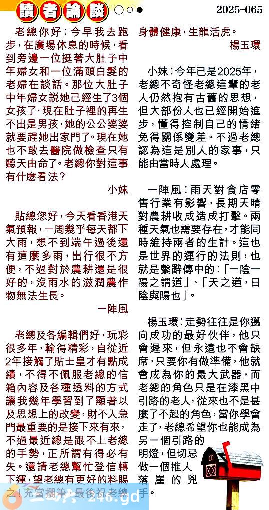 1.老總你好:今早我去跑步,在廣場休息的時候,看到旁邊一位挺著大肚子中年婦女和一位滿頭白爱的老婦在談話。那位大肚子中年婦女說她已經生了3個女孩了,現在肚子裡的再生不出是男孩,她的公公婆婆就要趕她出家門了。現在她也不敢去醫院做檢查只有聽天由命了。老總你對這事有什麼看法?小妹