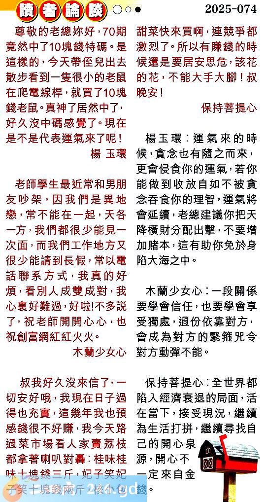 第零七四期讀者論談 1.尊敬的老總你好,70期竟然中了10塊錢特碼。是這樣的,今天帶侄兒出去散步看到一隻很小的老鼠在爬電線桿,就買了10塊錢老鼠。真神了居然中了,好久沒中碼感覺了。現在是不是代表運氣來了呢!楊玉環 〖楊玉環〗:運氣來的時候,貪念也有隨之而來,更會侵食你的運氣,若你能做到收放自如不被貪念吞食你的理智,運氣將會延續,老總建議你把天降橫財分配出擊,不要增加賭本,這有助你免於身陷大海之中。 2.老師學生最近常和男朋友吵架,因我們是異地戀,常不能在一起,天各一方,我們都很少能見一次面而我們工作地方又很少能請到長假,常以電話聯系方式,我真的好煩,看別人成雙成對,我心裏好難過,好啦!不多說了,祝老師開開心心,也祝創富網紅紅火火。木蘭少女心 〖木蘭少女心〗:一段關係要學會信任,也要學會享受獨處,過份依靠對方,會成為對方的緊箍咒令對方動彈不能。 3.叔我好久沒來信了,一切安好哦,我現在日子過得也充實,這幾年我也預感錢很不好賺,我今天路過菜市場看人家賣荔枝都拿著喇叭對轟:桂味桂味十塊錢三斤,妃子笑妃子笑十塊錢兩斤,核小包甜菜快來買啊,連競爭都激烈了。所以有賺錢的時候還是要居安思危,該花的花,不能大手大腳!叔晚安!保持菩提心 〖保持菩提心〗:全世界都陷入經濟衰退的局面,活在當下,接受現況,繼續為生活打拼,繼續尋找自己的開心泉源,開心不一定來自金錢。
