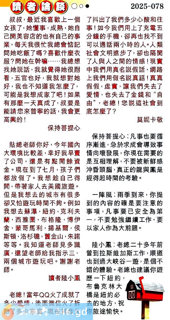 第零七八期讀者論談 1叔叔,最近我喜歡上一個女孩了,她懂事,成熟,她自己開美容店的也有自己的事業,每天我很忙我總會惦記問她吃飯了嗎?喜歡什麼衣服?問她在幹......我總想找她說話,我就覺得她很耐看,五官也好,我就想對她好,我也不知道我怎麼了,可能是我想成家了吧!如果有那麼一天真成了,叔要是能請您來普寧的話,我會更高興的!保持菩提心 〖保持菩提心〗:凡事也要循序漸進,急於求成會導致事情向壞發展,你現在需要的是互相理解,不要被新鮮感沖昏頭腦,真正的龍與鳳是經得起時間的考驗。 2.貼總老師你好,今年國內大環境比較差,幸好我早賣了公司,還是有點閒餘資金。現在到了七月,孩子們都放假了。我想趁自己得閒,帶著家人去美國旅遊。但是我想去的城市有很多卻又怕遊玩時間不夠。例如我想去蘇瀑,紐約,克利夫蘭,西雅圖,布格隆,博伊舍,蒙哥馬利,揚基爾,侯斯頓,洛杉磯,舊金山,朱諾等等。我知道老師見多識廣,還望老師給我指示三、兩個城市遊玩吧。謝謝老師。讀者陸小鳳 〖陸小鳳〗:老總二十多年前曾到拉斯維加斯工作,順道也到過大峽谷一遊,是個不錯的體驗。老總也建議你遊歷一下紐約布鲁克林大橋是紐約必去的地方,祝你旅途愉快。 3.老總!當年火了成就了多少愛情,後面微信火了拆散了多少家庭,現在抖音火了抖出了我們多少心酸和往事!如今我們用上了充電五分鐘的手機,卻再也找不到可以通話兩小時的人。人類社會文明進步了,卻也隔閡了人與人之間的情感!現實中我們用真名說假話,網路上我們用假名說真話!真真假假,虛實,讓我們失去了愛情,也失去了金錢和“自由",老總!您說這社會到底怎麼了?莫妮卡敬 〖一陣風〗:雨季到來,你提到的內容的確是要注意的事項,凡事要已安全為第一,不要勉強繼續工作,要以家人作為大前題。