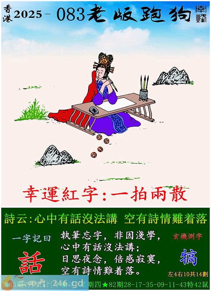 2025083期083期:老版跑狗玄機一字記之曰:【話】 詩云:心中有話沒法講,空有詩情難着落。