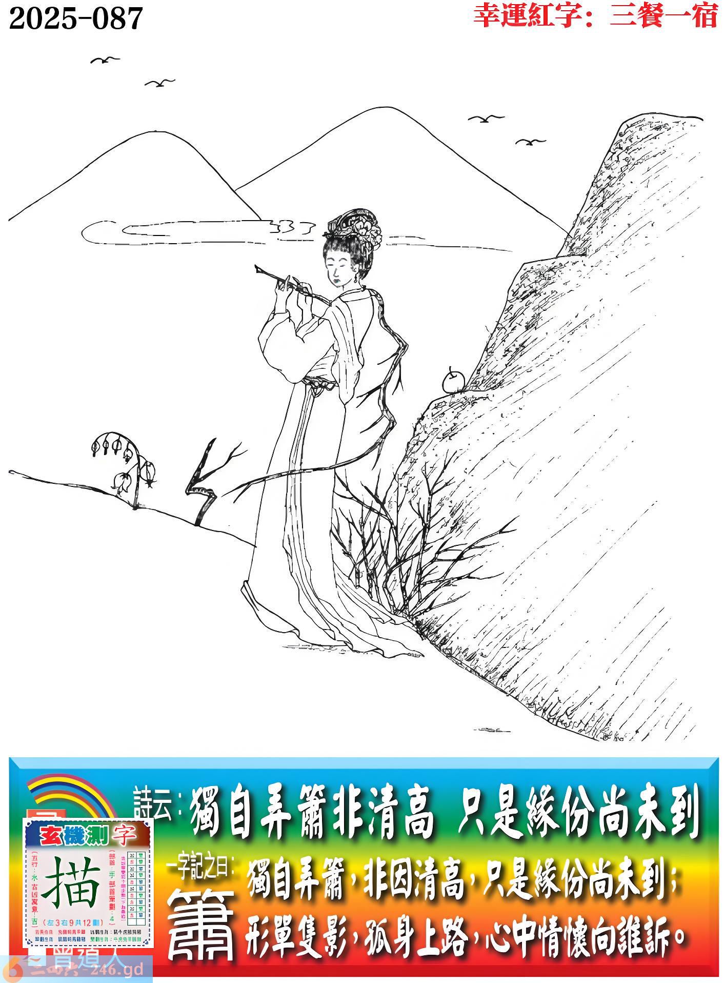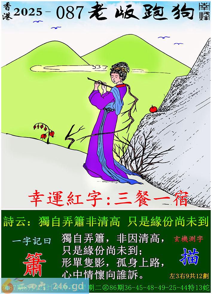 087期老版跑狗一字記之曰:【簫】 詩雲:獨自弄簫非清高,只是緣份尚未到。 獨自弄簫,非因清高,只是緣份尚未到; 形單隻影,孤身上路,心中情懷向誰訴。 玄機測字:《描》