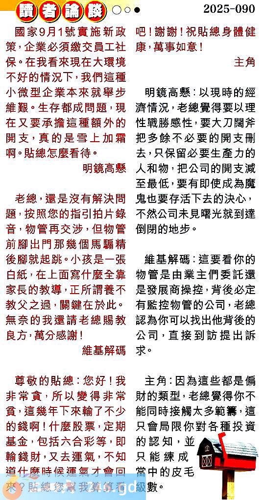 第零九零期讀者論談 1.國家9月1號實施新政策,企業必須繳交員工社保。在我看來現在大環境不好的情況下,我們這種小微型企業本來就舉步維艱。生存都成問題,現在又要承擔這種額外的開支,真的是雪上加霜啊。貼總怎麼看待。明鏡高懸 〖明鏡高懸〗:以現時的經濟情況,老總覺得要以理性戰勝感性,要大刀闊斧把多餘不必要的開支刪去,只保留必要生產力的人和物,把公司的開支減至最低,要有即使成為魔鬼也要存活下去的決心,不然公司未見曙光就到達倒閉的地步。 2.老總,還是沒有解決問題,按照您的指引拍片錄音,物管再交涉,但物管前腳出門那幾個馬騸精後腳就起跳。小孩是一張白紙,在上面寫什麼全靠家長的教導,正所謂養不教父之過,關鍵在於此。無奈的我還請老總賜教良方,萬分感謝!維基解碼 〖維基解碼〗:這要看你的物管是由業主們委詆還是發展商操控,背後必定有監控物管的公司,老總認為你可以找出他背後的公司,直接到訪提出訴求。 3.尊敬的貼總:您好!我非常貪,所以變得非常貧,這幾年下來輸了不少的錢啊!什麼股票,定期基金,包括六合彩等,即輸錢財,又去運氣,不知道什麼時候運氣才會回來?貼總您幫我算算看吧!謝謝!祝貼總身體健康,萬事如意!主角 〖主角〗:因為這些都是偏財的類型,老總覺得你不能同時接觸太多範籌,這只會局限你對各種投資的認知,並只能練成當中的皮毛級數。