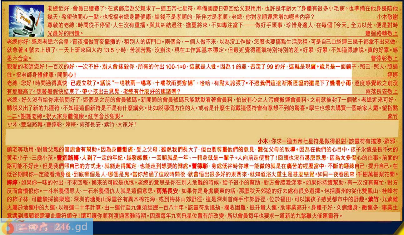 【6】.老總。好久沒有給你來信問好了,這個是之前的會員號碼。新開通的會員號碼只能默默看著會員料,怕被有心之人污蠛搬運會員料。之前就被封了一個號。老總近來可好,聽說又出了新的九運符,不知道這個新符是不是有什麼講究。比如說哪個方位的人。或者是什麼生肖戴這個符會有意想不到的驚喜。學生也想去購買一個給家人戴。望指點一二。謝謝老總。祝大家身體健康。紅字含沙射影。紫竹