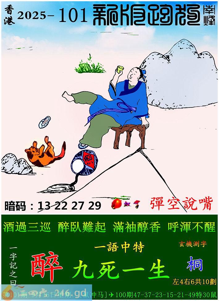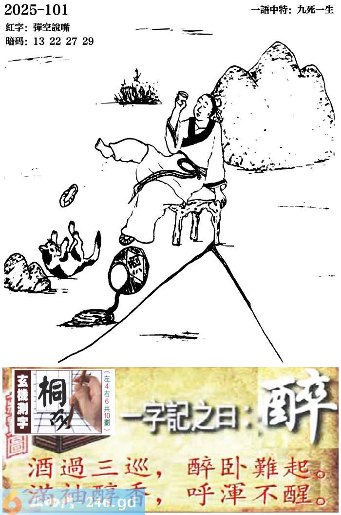 101期跑狗一字記之曰:【醉】 酒過三巡,醉臥難起。 滿袖醇香,呼渾不醒。 玄機測字:《桐》 一語中特:九死一生