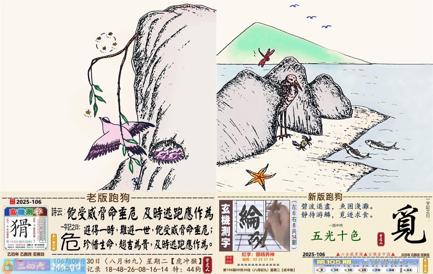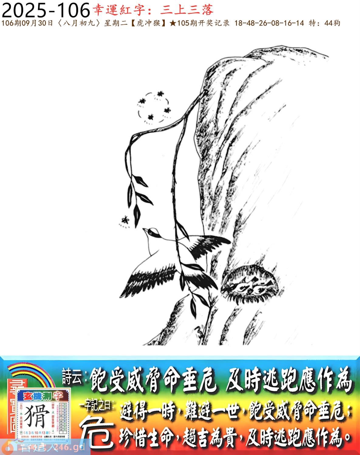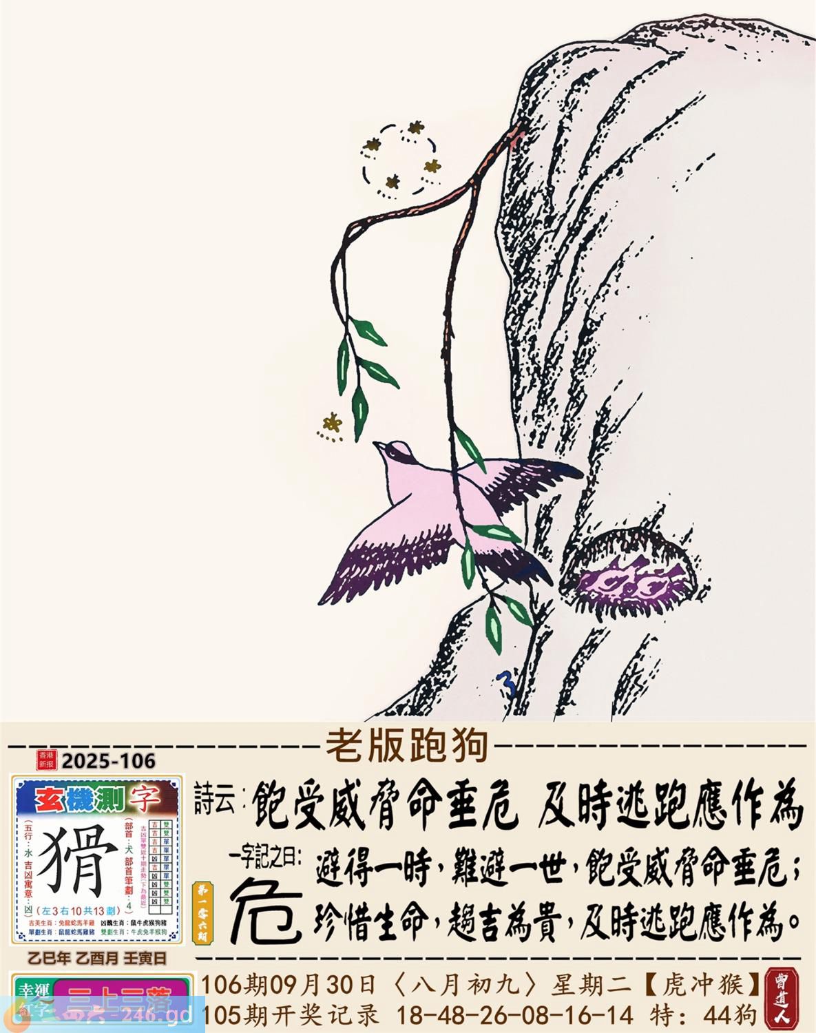 2025年9月30日106期侯(丙申)(金箔金) 106期:老版跑狗玄機一字記之曰:【危】 詩云:飽受威脅命垂危及時逃跑應作為 避得一時,難避一世,飽受威脅命垂危; 珍惜生命,趨吉為貴,及時逃跑應作為。 玄機測字:《猾》 密圖詩:一二好運伴八在 《記》:三人玩耍最開心 特碼大小單雙句:一山不能容二虎 今期必中:貂禪 106期:特碼歇后語 风吹墙头草-----哪边硬往哪边倒 106期正版四字梅花诗:有模有样。 106期火车头:烧伤兔。诗:马死牛伤,二六花开好运来。 106期香港第一手欲钱料:火。 106期曾道人说:“猪?” 106期另版四字梅:四脚朝天。 106期香港第一手欲钱料:欲钱看北京首部的建设年代。 106期曾道人说:““女人二十以上出门经常会带什么东西”? 106期:二字經:忠奸 106期:观音是特码 106期:智力金壤:万人空巷 106期:信箱紅字:【颐精養神】 106期:【暗碼:02-22-31-34】 106期:一語中特:【五光十色】 發财玄機圖:三窟藏身快速敏捷圖中明兔紅綠 106期:藏寳圖 新:陌上最怜芳草色 老:为问只今江海上 禁:狗禁:2尾玄機字《纬》 2025年106期【生活幽默】版 〖黄絲帶〗 一天,英文老師帶了録音機來上課,準備播放一首名爲《黄絲帶結在老榆樹上》的歌。 聽歌前,老師略述這首歌的故事:“一個快要出獄的犯人,寫信給他的妻子,請她在家門前的老愉樹上結條黄絲帶,以示原諒。他坐車經過看到黄絲帶便下車,否則,衹好乘車繼續遠去。" 聽完歌後,老師讓同學們寫下感想。有個同學這樣寫道:“雖然我已努力用功,但英文成绩仍不好,老師若能原諒我,請在下次上課時,頭上結條黄絲帶。”