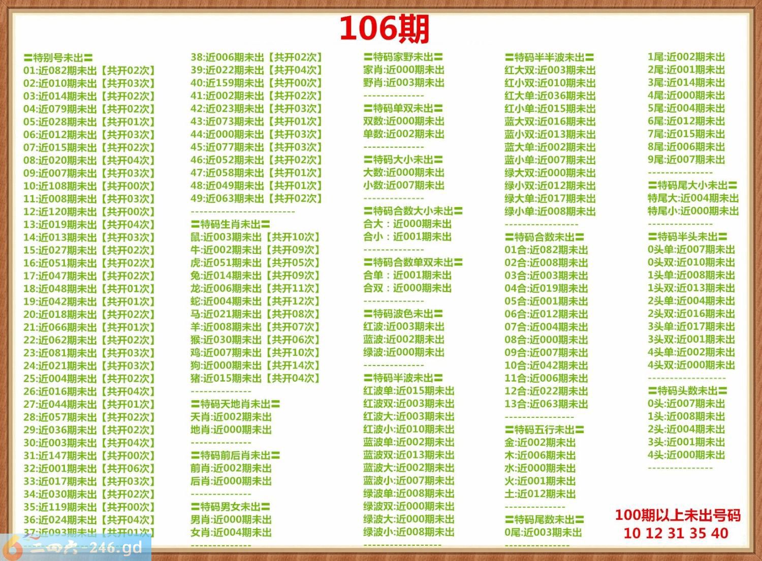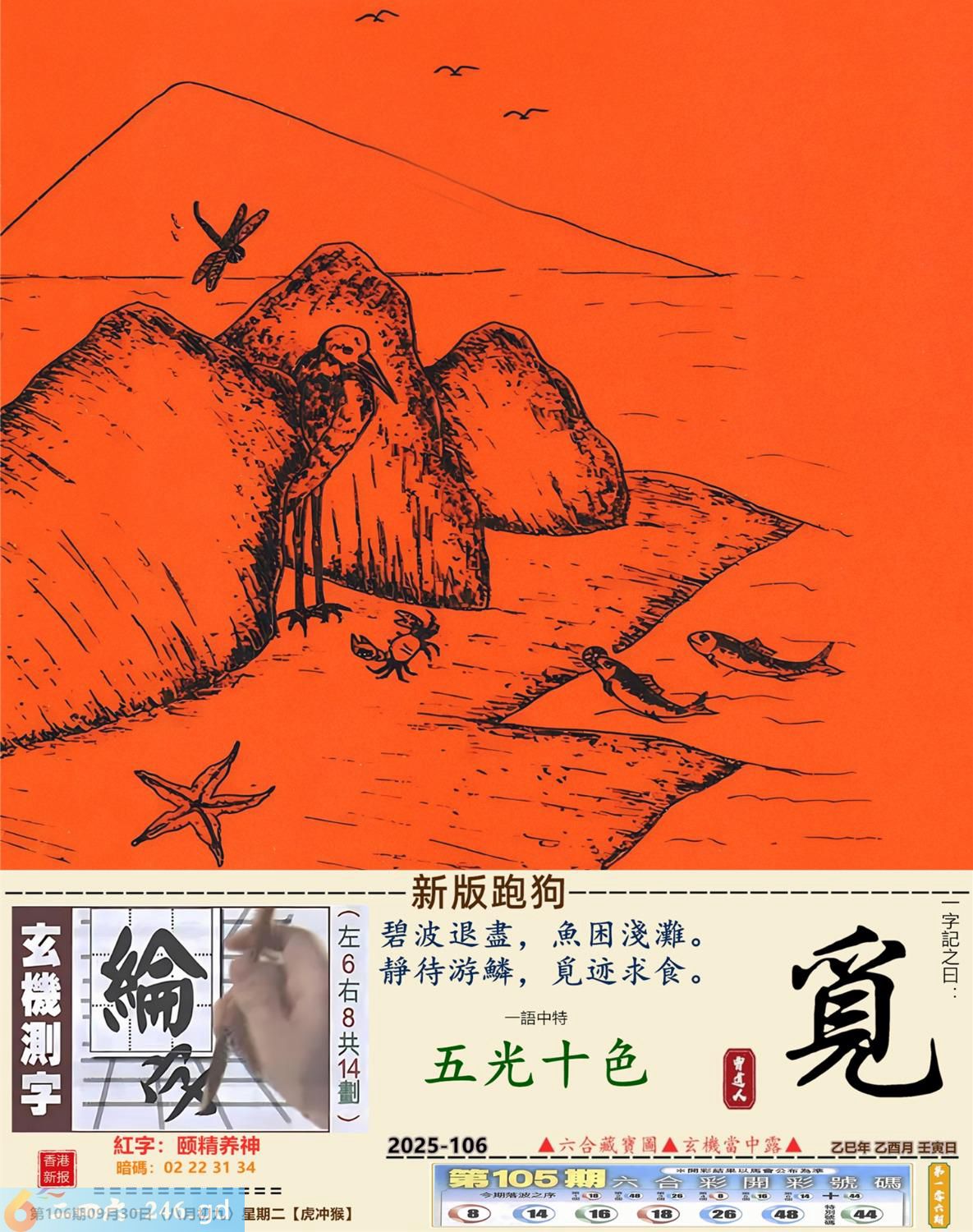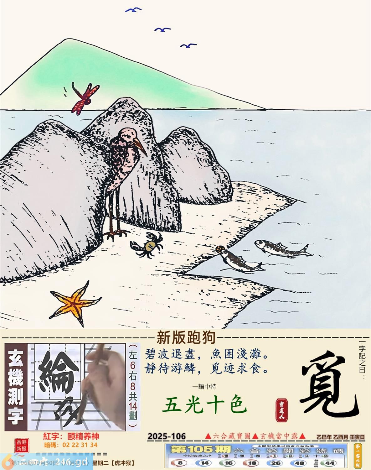2025年9月30日106期侯(丙申)(金箔金) 106期:老版跑狗玄機一字記之曰:【危】 詩云:飽受威脅命垂危及時逃跑應作為 避得一時,難避一世,飽受威脅命垂危; 珍惜生命,趨吉為貴,及時逃跑應作為。 玄機測字:《猾》 密圖詩:一二好運伴八在 《記》:三人玩耍最開心 特碼大小單雙句:一山不能容二虎 今期必中:貂禪 106期:特碼歇后語 风吹墙头草-----哪边硬往哪边倒 106期正版四字梅花诗:有模有样。 106期火车头:烧伤兔。诗:马死牛伤,二六花开好运来。 106期香港第一手欲钱料:火。 106期曾道人说:“猪?” 106期另版四字梅:四脚朝天。 106期香港第一手欲钱料:欲钱看北京首部的建设年代。 106期曾道人说:““女人二十以上出门经常会带什么东西”? 106期:二字經:忠奸 106期:观音是特码 106期:智力金壤:万人空巷 106期:信箱紅字:【颐精養神】 106期:【暗碼:02-22-31-34】 106期:一語中特:【五光十色】 發财玄機圖:三窟藏身快速敏捷圖中明兔紅綠 106期:藏寳圖 新:陌上最怜芳草色 老:为问只今江海上 禁:狗禁:2尾玄機字《纬》 2025年106期【生活幽默】版 〖黄絲帶〗 一天,英文老師帶了録音機來上課,準備播放一首名爲《黄絲帶結在老榆樹上》的歌。 聽歌前,老師略述這首歌的故事:“一個快要出獄的犯人,寫信給他的妻子,請她在家門前的老愉樹上結條黄絲帶,以示原諒。他坐車經過看到黄絲帶便下車,否則,衹好乘車繼續遠去。" 聽完歌後,老師讓同學們寫下感想。有個同學這樣寫道:“雖然我已努力用功,但英文成绩仍不好,老師若能原諒我,請在下次上課時,頭上結條黄絲帶。”