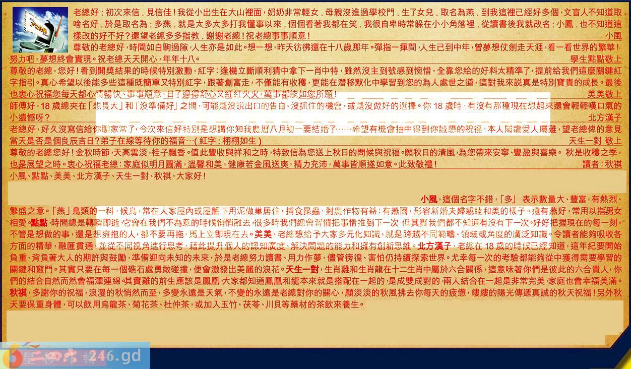 第108期《六合皇信箱文字版》10000%正確!!!正版二四六論壇*精心製作!!! 小風、點點、美美、北方漢子、天生一對、秋祺,大家好! 【1】.老總好:初次來信.見信佳!我從小出生在大山裡面,奶奶非常輕女.母親沒進過學校門.生了女兒.取名為燕.到我這裡已經好多個,文盲人不知道取啥名好.於是取名為:多燕,就是太多太多打我懂事以來.個個看著我都在笑.我很自卑時常躲在小小角落裡.從讀書後我就改名:小鳳.也不知道這樣改的好不好?還望老總多多指教.謝謝老總!祝老總事事順意!小風 〖小風〗:這個名字不錯,「多」表示數量大、豐富,有熱烈、繁盛之意。「燕」鳥類的一科,候鳥常在人家屋內或屋管下用泥做巢居住,捕食昆蟲,對農作物有益:有燕雨,形容新婚夫婦親睦和美的樣子。還有燕好,常用以指男女相爱。 【2】.尊敬的老總好,時間如白駒過隙,人生亦是如此。想一想,昨天彷佛還在十八歲那年。彈指一揮,間人生已到中年,曾夢想仗劍走天涯,看一看世界的繁華!努力吧,夢想終會實現。祝老總天天開心,年年十八。生點點敬上 〖點點〗:時間總是轉瞬即逝,它會在我們不為意的時候俏悄離去,很多時我們總會習慣把事情推到下一次,但其寶我們都不知道有沒有下一次。好好把握現在的每一刻,不管是想做的事,還是想擁抱的人都不要再拖,馬上立即現在去。 【3】.尊敬的老總,您好!看到開獎結果的時候特別激動,紅字:逢機立斷順利猜中拿下一肖中特,雖然沒主到號感到惋惜,全靠您給的好料太精準了,提前給我們這麼關鍵紅字指引。真心希望以後能多些這種既簡單又特別紅字,跟著創富走,不僅能有收穫,更能在潛移默化中學習到您的為人處世之道,這對我來說真是特別寶貴的成長。最後也衷心祝福您每天都心情暢快、事事順意,日子過得舒心又红红火火,萬事都能如您所願!美美敬上 〖美美〗:老總想給予大家多元化知識,就是跨越不同範疇、領域或角度的廣泛知識。令讀者能夠吸收各方面的精華,融匯貫通,並從不同視角進行思考,藉此提升個人的認知廣度、解決問題的能力和擁有創新思維。 【4】.師傅好,18歲總夾在「想長大」和「沒準備好」之間,可能是沒說出口的告白,沒抓住的機會,或是沒做好的選擇。你18歲時,有沒有那種現在想起來還會輕輕嘆口氣的小遺憾呀?北方漢子 〖北方漢子〗:老總在18歲的時候已經知道,這年紀要開始負重、背負著大人的期許與鼓勵,準備迎向未知的未來,於是老總努力讀書、用力作萝,盡管镑徨、害怕仍持續探索世界。尤幸每一次的考驗都能夠從中獲得需要學習的關鍵和竅門。其實只要在每個礁石處勇敢碰撞,便會激發出美麗的浪花。 【5】.老總好,好久沒寫信給你聊家常了,今次来信好特別是想講你知我農曆八月初一要結婚......希望有機會抽中得到你誠懇的祝福,本人屬龍愛人屬雞,望老總俾的意見當天是否是個良辰吉日?弟子在線等待你的福音...(紅字:栩栩如生)天生一對敬上 〖天生一對〗:生肖雞和生肖龍在十二生肖中屬於六合關係,這意味著你們是彼此的六合貴人,你們的結合自然而然會福澤連綿,其實雞的前生應該是鳳凰,大家都知道鳳凰和龍本來就是搭配在一起的,是成雙成對的,兩人結合在一起是非常完美,家庭也會幸福美滿。 【6】.尊敬的老總您好!金秋時節,天高雲淡,桂子飄香。值此豐收與祥和之時,特致信為您送上秋日的問候與祝福。願秋日的清風,為您帶來安寧、豐盈與喜樂。秋是收穫之季,也是展望之時。衷心祝福老總:家庭似明月圓滿,溫馨和美,健康若金風送爽,精力充沛,萬事皆順遂如意。此致敬禮!讀者:秋祺 〖秋祺〗:多謝你的祝福,浪漫的秋悄然而至,多變永遠是天氣,不變的永遠是老總對你的關心,願淡淡的秋風拂去你每天的疲憊,縷縷的陽光傳遞真誠的秋天祝福!另外秋天要保重身體,可以飲用烏龍茶、菊花茶、杜仲茶,或加入玉竹、茯苓、川貝等藥材的茶飲來養生。 紅字:星移斗轉 暗码:03091631 [释义]指季节或时间的变化。 [出处]元·马致远《陈抟高卧》第三折:“直睡的陵迁谷变,石烂松枯,斗转星移。”