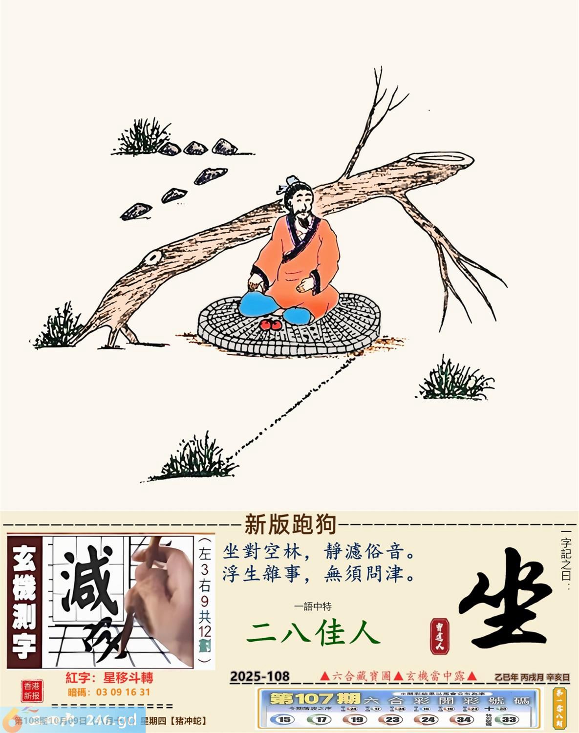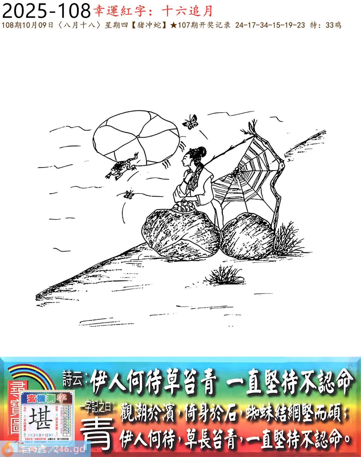本帖最后由小歪于2025-10-821:50编辑 2025年10月9日108期蛇(乙巳)(钗钏金) 108期:老版跑狗玄機一字記之曰:【青】 詩云:伊人何待草苔青一直堅持不認命 觀潮於濱,倚身於石,蜘蛛結網堅而碩; 伊人何待,草長苔青,一直堅持不認命。 玄機測字:《堪》 密圖詩:打開大門迎財神 《記》:八仙過海顯蛇兔 特碼大小單雙句:天涯海角 今期必中:劉協 108期:特碼歇后語 膏药贴嘴巴-----难开口(号?) 108期正版四字梅花诗:齐头并进。 108期火车头:烧伤马。诗:猪死猴伤,一九三肖对一双。 108期香港第一手欲钱料:床前明月光。 108期曾道人说:“月亮?” 108期另版四字梅:三来三去。 108期香港第一手欲钱料:欲钱看世上好看的动物。 108期曾道人说:“女人二十耍酒疯是什么样的”? 108期:二字經:攻擊 108期:狗熊是特码 108期:智力金壤:黔驴技穷 108期:信箱紅字:【星移斗轉】 108期:【暗碼:03-09-16-31】 108期:一語中特:【二八佳人】 玄機發財圖:圖中明狗藍綠 108期:藏寳圖 新:云残香瘦春犹可 老:逢郎欲语低头笑 禁:虎禁:5尾玄機字《憧》 2025年108期【生活幽默】版 〖你有什么根據〗 夫婦倆坐小汽車,來到鄉裏,丈夫在開車,車子開了很久……。 突然,妻子問:“你不覺得我們迷路了嗎?” 丈夫:“你有什麽根據?我開車能力一直很好的。” 妻子:“你剛軋過去的那條死狗,我們半小時前已經軋過一次了。”