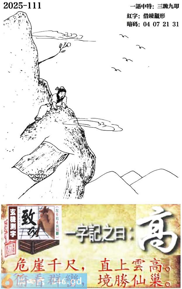 111期跑狗一字記之曰:【高】 危崖千尺,直上雲高。 俯看群巒,境勝仙巢。