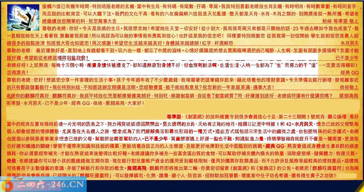 【1】.接觸六信已有幾年時間,特別培服老總的玄機,當中有生肖,有特碼,有尾數,孖碼,零尾。我就特別喜歡老總放生肖玄機,有時明肖,有時數筆劃,有時同音字,而且說的比較肯定,可以大膽下注。我們的文化不高,看有的六友偏偏解六信就是天花亂墜,整天都是天肖,水肖,木肖之類的,到開獎後就一無所獲,希望老總繼續放些簡單的料,祝您萬事大吉粉絲等準狠敬上