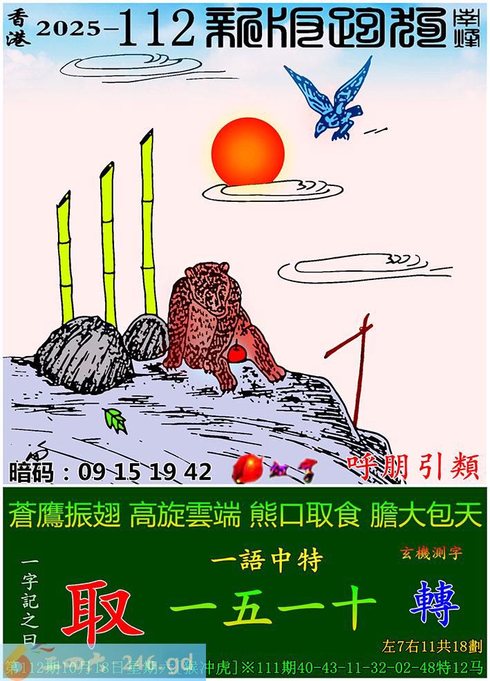 112期跑狗一字記之曰:【取】 蒼鷹振翅,高旋雲端。 熊口取食,膽大包天。 玄機測字:《轉》 一語中特:一五一十
