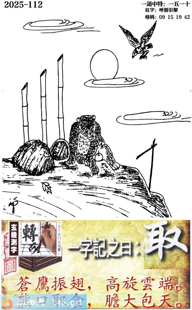 112期跑狗一字記之曰:【取】 蒼鷹振翅,高旋雲端。 熊口取食,膽大包天。