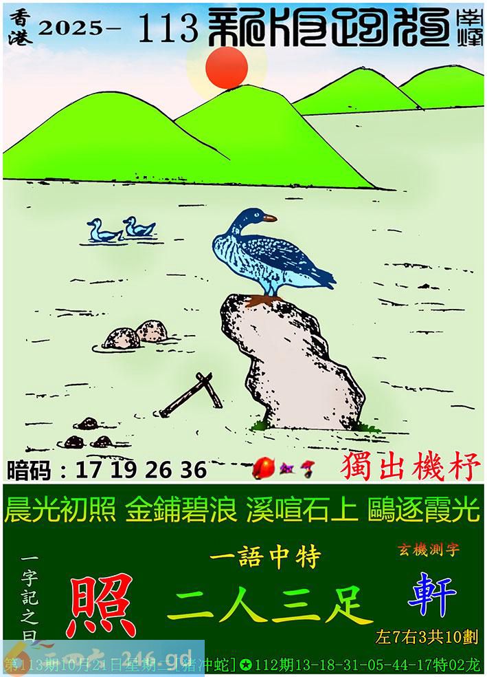 113期跑狗一字記之曰:【照】 晨光初照,金鋪碧浪。 溪喧石上,鷗逐霞光。 玄機測字:《軒》 一語中特:二人三足