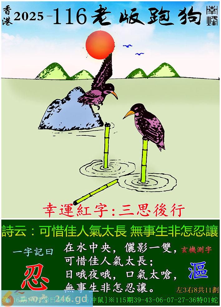 116期老版跑狗一字記之曰:【忍】 詩雲:可惜佳人氣太長,無事生非怎忍讓。 在水中央,儷影一雙,可惜佳人氣太長; 日哦夜哦,口氣太嗆,無事生非怎忍讓。 玄機測字:《漚》
