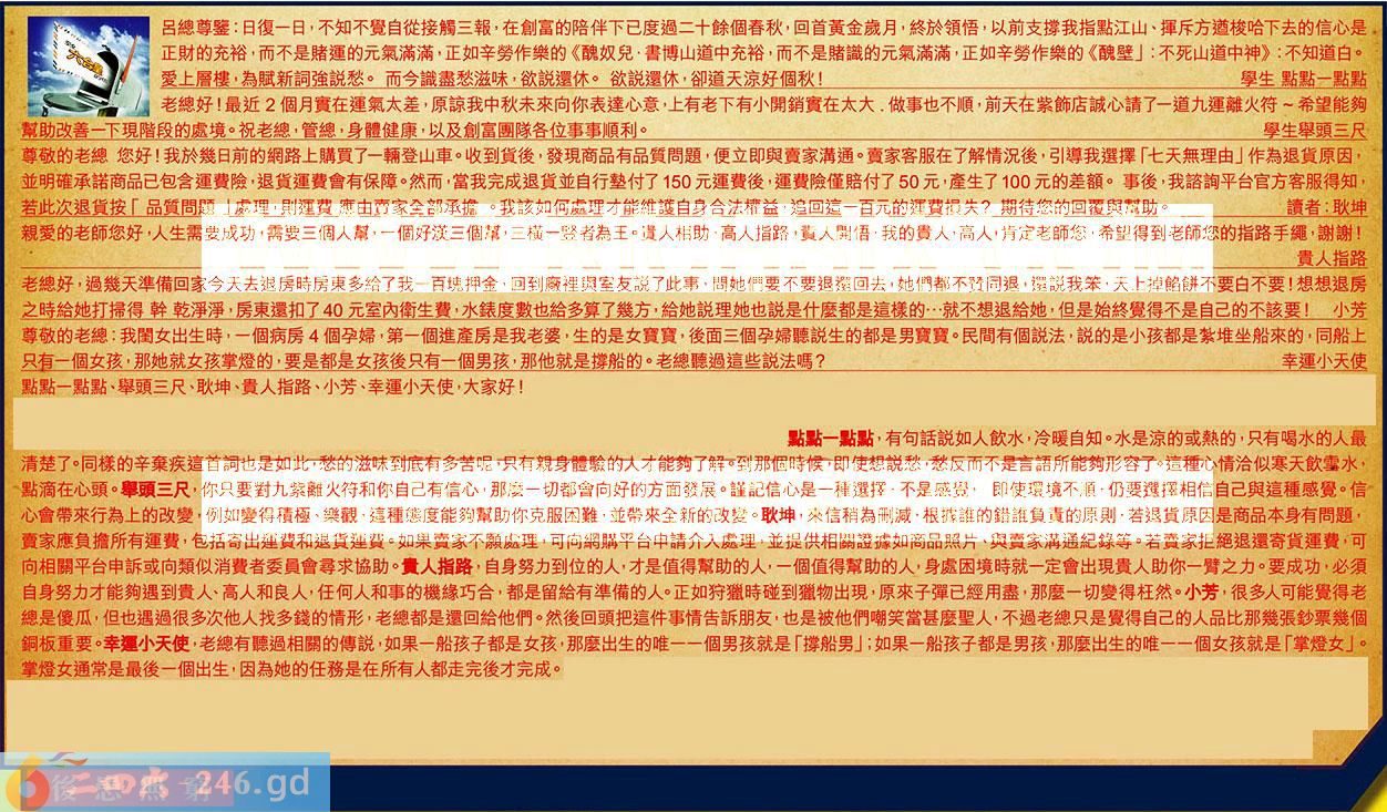 第117期《六合皇信箱文字版》10000%正確!!!正版二四六論壇*精心製作!!! 點點一點點、舉頭三尺、耿坤、貴人指路、小芳、幸運小天使,大家好! 【1】.呂總尊鑒:日復一日,不知不覺自從接觸三報,在創富的陪伴下已度過二十餘個春秋回首黃金歲月,終於領悟,以前支撐我指點江山、揮斥方遒梭哈下去的信心是正財的充裕,而不是賭運的元氣滿滿,正如辛勞作樂的《醜奴兒.書博山道中充裕,而不是賭識的元氣滿滿,正如辛勞作樂的《醜壁」:不死山道中神》:不知道白。愛上層樓,為賦新詞強說愁。而今識盡愁滋味,欲說還休。欲說還休,卻道天凉好個秋!學生點點一點點 〖點點一點點〗:有句話說如人飲水,冷暖自知。水是凉的或熱的,只有喝水的人最清楚了。同樣的辛棄疾這首詞也是如此,愁的滋味到底有多苦呢,只有親身體驗的人才能夠了解。到那個時候即使想說愁,愁反而不是言語所能夠形容了。這種心情治似寒天飲雪水,點滴在心頭。 【2】.老總好!最近2個月實在運氣太差,原諒我中秋未來向你表達心意,上有老下有小開銷實在太大.做事也不順,前天在紫飾店誠心請了一道九運離火符希望能夠幫助改善一下現階段的處境。祝老總,管總,身體健康,以及創富團隊各位事事順利。學生舉頭三尺 〖舉頭三尺〗:你只要對九紫離火符和你自己有信心,那麼一切都會向好的方面發展。謹記信心是一種選擇,不是感覺,即使環境不順,仍要選擇相信自己與這種感覺。信心會帶來行為上的改變,例如變得積極、樂觀,這種態度能夠幫助你克服困難、並帶來全新的改變。 【3】.尊敬的老總您好!我於幾日前的網路上購買了一輛登山車。收到貨後,發現商品有品質問題,便立即與賣家溝通。賣家客服在了解情況後,引導我選擇「七天無理由」作為退貨原因,並明確承諾商品已包含運費險退貨運費會有保障。然而,當我完成退貨並自行墊付了150元運費後,運費險僅賠付了50元產生了100元的差額。事後,我諮詢平台官方客服得知,若此次退貨按「品質問題」處理,則運费應由賣家全部承擔。我該如何處理才能維護自身合法權益,追回這一百元的運費損失?期待您的回覆與幫助。讀者:耿坤 〖耿坤〗:來信稍為刪減,根據誰的錯誰負責的原則,若退貨原因是商品本身有問題,賣家應負擔所有運費,包括寄出運费和退貨運費。如果賣家不願處理,可向網購平台申請介入處理,並提供相關證據如商品照片、與賣家溝通紀錄等。若賣家拒絕退還寄貨運費,可向相關平台申訴或向類似消費者委員會尋求協助。 【4】.親愛的老師您好,人生需要成功需要三個人幫,一個好漢三個幫,三橫一豎者為王。量人相助,高人指路,資人開悟,我的贵人,高人肯定老師您,希望得到老師您的指路手繩,謝謝!貴人指路 〖貴人指路〗:自身努力到位的人,才是值得幫助的人,一個值得幫助的人,身處困境時就一定會出現貴人助你一臂之力。要成功,必須自身努力才能夠遇到貴人、高人和良人,任何人和事的機緣巧合,都是留給有準備的人。正如狩獵時碰到獵物出現,原來子彈已經用盡,那麼一切變得枉然。 【5】.老總好,過幾天準備回家今天去退房時房東多給了我一百塊押金,回到廠裡與室友說了此事,問她們要不要退還回去,她們都不赞同退,還說我笨天上掉餡餅不要白不要!想想退房之時給她打掃得幹乾淨淨,房東還扣了40元室內衛生费,水錶度數也給多算了幾方,給她說理她也說是什麼都是這樣的...就不想退給她,但是始終覺得不是自己的不該要!小芳 〖小芳〗:很多人可能覺得老總是傻瓜,但也遇過很多次他人找多錢的情形,老總都是還回給他們。然後回頭把這件事情告訴朋友,也是被他們嘲笑當甚麼聖人,不過老總只是覺得自己的人品比那幾張鈔票幾個銅板重要。 【6】.尊敬的老總:我閨女出生時,一個病房4個孕婦,第一個進產房是我老婆,生的是女寶寶,後面三個孕婦聽說生的都是男寶寶。民間有個說法,說的是小孩都是禁堆坐船來的,同船上只有一個女孩,那她就女孩掌燈的,要是都是女孩後只有一個男孩,那他就是撑船的。老總聽過這些說法嗎?幸運小天使 〖幸運小天使〗:老總有聽過相關的傳說,如果一船孩子都是女孩,那麼出生的唯一個男孩就是「撐船男」;如果一船孩子都是男孩,那麼出生的唯一個女孩就是「掌燈女」。掌燈女通常是最後一個出生,因為她的任務是在所有人都走完後才完成。 紅字:後患無窮 暗码:02162530 [释义]指今后的祸害及忧患没有穷尽。 [出处]《三国志·魏志·武帝纪》:“夫刘备,人杰也。今不击,必有后患。”
