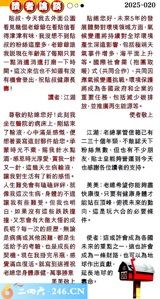 第零二零期讀者論談 1.貼叔,今天我去外面公園看見幾個老爺爺在看貼信看得津津有味,我沒想不到貼叔的粉絲這麼多,老爺爺跟我說現在年齡高了每期只買一點消遣消遣打磨一下時間。這次來信也不知道有沒有機會登出,祝貼叔健康長壽!讀者:江湖 〖江湖〗:老總掌管信箱己有二三十個年頭,不敢認天下粉絲無數,但也有不少朋友,貼士皇能夠營運到今天也感謝各位讀者的支持。 2.尊敬的貼總您好!此刻我坐在醫院的病床上,剛結束了輸液,心中滿是感慨,便想著要寫這封郵件給您。承蒙時光不棄,賜我針水點滴,感恩時光厚愛,賞我一針又一針,這幾天生病輸液,讓我對生活有了新的感悟。人生難免會有磕磕絆絆,就像我這次生病,身體的不適讓我有些難受。但我也明白,如果沒有這些跌跌撞撞,又怎會有大徹大悟的成長呢?每一次的經歷,無論是病痛或其他困難都是生活給予的考驗,也是成長的契機。現在我掛完吊瓶,感.覺滿血復活。就寫到這裡祝老總您身體康健,萬事勝意美美敬上 〖美美〗:老總希望你能夠盡快康復,只要有健康身體才能站在頂峰,俯視未來的動向,這是玩六合的必要條件。 3.貼總您好,未來5年的發展雛勢對環境領域方面,氣候變遷將持續對全球環境產生深遠影響,包括極端天氣事件增多,海平面上升等。國際社會需((抱團取暖)式((共同合作),共同因應氣候變遷挑戰。環境保護將成為各國政府和企業的重要任務,包括減少碳排放,並推廣再生能源等。使者敬上 〖使者〗:這或許會成為各國未來的重點之一,這也許會成為一條財路,也可以為地球作出貢獻,延長地球的壽命。