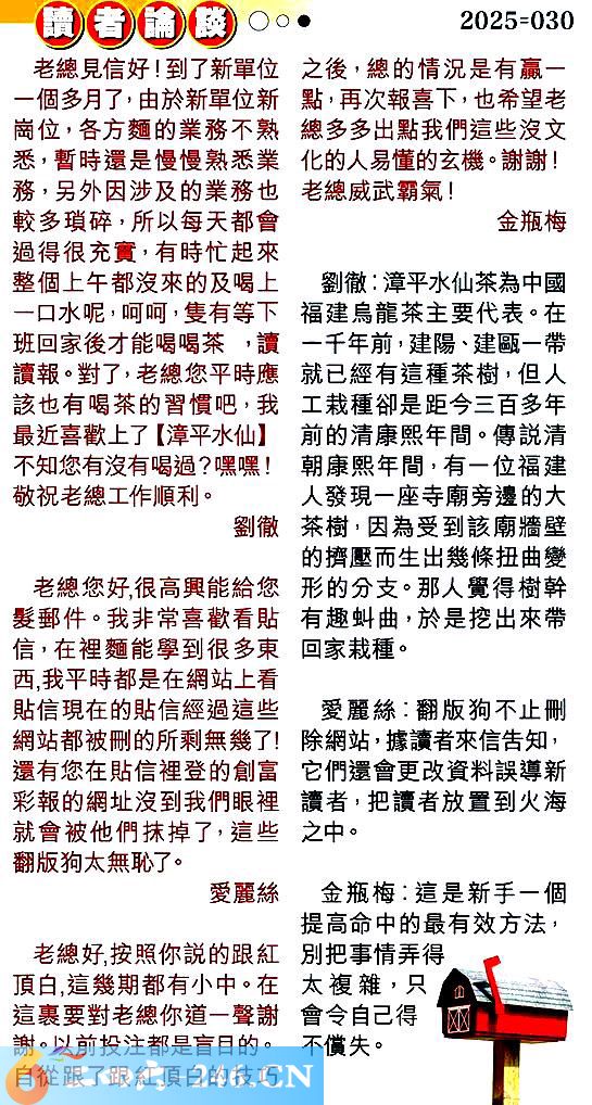2.老總您好,很高興能給您髪郵件。我非常喜歡看貼信,在裡魎能學到很多東西,我平時都是在網站上看貼信現在的貼信經過這些網站都被刪的所剩無幾了!還有您在貼信裡登的創富彩報的網址沒到我們眼裡就會被他們抹掉了,這些翻版狗太無恥了。愛麗絲