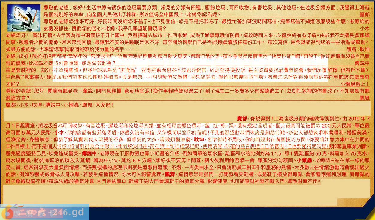 第125期《六合皇信箱文字版》10000%正確!!!正版二四六論壇*精心製作!!! 魔都、小木、耿坤、傳說中、小懶蟲、鳳舞,大家好! 【1】.尊敬的老總,您好!生活中總有很多的垃圾需要分類,常見的分類有四種:廚餘垃圾,可回收物,有害垃圾,其他垃圾。在垃圾分類方面,我覺得上海就是個特別好的表率,向全國人民做出了榜樣,所以值得全中國跟上。老總您認為呢?魔都 〖魔都〗:你說得對!上海垃圾分類的確做得很到位,由2019年7月1日起實施,將垃圾分為可回收物、有害垃圾、濕垃圾和乾垃圾四類,並有相應的顏色標示,藍、紅、棕、黑還有規定違規者,個人最高可能被罰款200元人民幣,單粒最高可罰5萬元人民幣。 【2】.尊敬的老總您近來可好,好長時間沒給您來信了。也不見登信,您是不是把我忘了。最近忙著加班沒時間寫信,提筆寫信不知道怎麼說些什麼。老總給的玄機沒抓住,愧對您的苦心。老總,我平凡願望能實現嗎?小木 〖小木〗:你的說話有些前後矛盾,你很久沒有來信,又怎樣可以登你的信呢!平凡的願望對我們來說是知易行難。多數人都想冀求事業順利、婚姻美滿、經濟足夠、身體無恙。但要了解其實現代人需要的不多,但想要的太多、導致煩惱無窮。 【3】.老總您好!冒昧打擾。去年因為家中兩個孩子升上國中,我選擇辭去城市工作回家鄉,成為了鄉鎮專職消防員。這段時間以來,心裡始終有些矛盾。由於我不太擅長處理與同事、領導者之間的關偽,常常感到困擾,最讓我不安的是睡眠經常不好,甚至開始懷疑自己是否能夠繼續勝任這份工作。這次寫信,是希望能得到您的一些指點或幫助。如果方便的話,也想請您幫我取個能帶給我力量的名......讀者:耿坤 〖耿坤〗:名字暫時不用改,你的問題出在溝通技巧方面。你要將注意力集中在共同的工作目標上,而不是個人情感。將同事視為合作夥伴,共同解決問題。而在與上司相處溝通時,使用清晰明確的語言表達自己的觀點,但也要懂得適時退讓和尊重專業判斷,避免過度堅持己見,以免造成衝突。 【4】.老總,您好!武松打虎那都是傳說裡的“限定技能”咱喝酒時能跟朋友嘮得熱火朝天、解解日常的乏,這本身就是超實用的“快樂技能”啊!再說了,你肯定還有沒被自己發現的優點,比如說不定特別會傾聽,或是做菜超香?傳說中 〖傳說中〗:老總現在下廚做飯也靠小紅書的介紹,例如簡單的蒸水蛋,雞蛋和水的比例約為1:1.5,即1隻雞蛋約50克,就需加入75克水。將水燒開後,將装有蛋液的碗放入蒸鍋,轉為中小火蒸約6-8分鐘。蒸好後不要馬上開蓋,關火後利用餘溫燜一會,讓蛋液均匀凝固。 【5】.這是套裝裡的一部分,不單獨售賣。但客戶誤以為是“非賣品”,覺得這東西根本不該對外銷售,於是堅持要投訴,甚至威脅要找消费者協會。我們反覆解釋,但客戶不聽。平台為了息事寧人,硬是讓我們商家退款還額外補償。很是無奈......明明我們沒做錯,卻只能妥協,就怕影響產品被下架。老總您說針對這種類型的客戶到底該怎麼應對才好?小懶蟲敬上! 〖小懶蟲〗:老總明白站在第一線的服務人員,經常得承受大量負面情緒,而多數機構的處理原則就是道歉再道歉。不過,一再委曲求全,只會消耗員工對工作和服務的熱情。大多數人在情緒激動時會說出過火的話,例如恐嚇或威脅或人身攻擊,若發生這種情況,你大可以報警處理。 【6】.尊敬的老總:您好!閒聊時聽到老一輩說,開門見鞋櫃,窮到地底泥!換作年輕時聽就過去了,到了現在三十多歲多少有點聽進去了!立刻把家裡的佈置改了。不知老總有聽過這方言?鳳舞 〖鳳舞〗:這個意思是指門一打開就看見鞋櫃,或是鞋子擺放得雜亂,會影響家運和財運,而雜亂的鞋子象徵財路不順。這說法緣於穢氣外露,大門是纳氣口,鞋櫃正對大門會讓鞋子的穢氣外露,影響健康,也可能讓財神能不願入門,導致財運不佳。 紅字:頭癢搔腳 暗码:01183739 [释义]比喻花了气力而于事无补。 [出处]汉·焦延寿《易林》卷十:“头痒搔跟,无益于疾。”