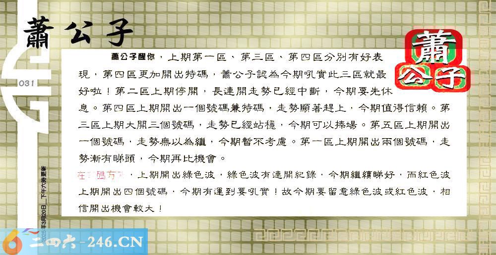 2025031期031期六合心水:绿色春天鸡羊肥,金秋土地火辣辣。心水玄机:每日三声从不误。