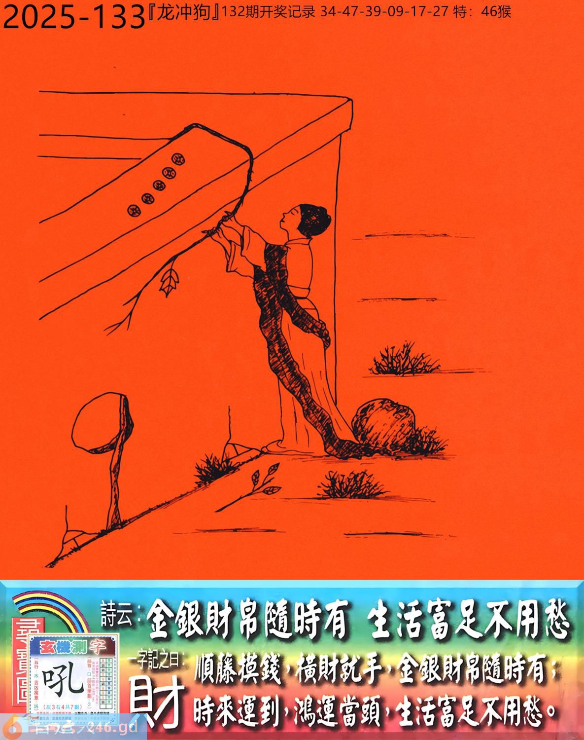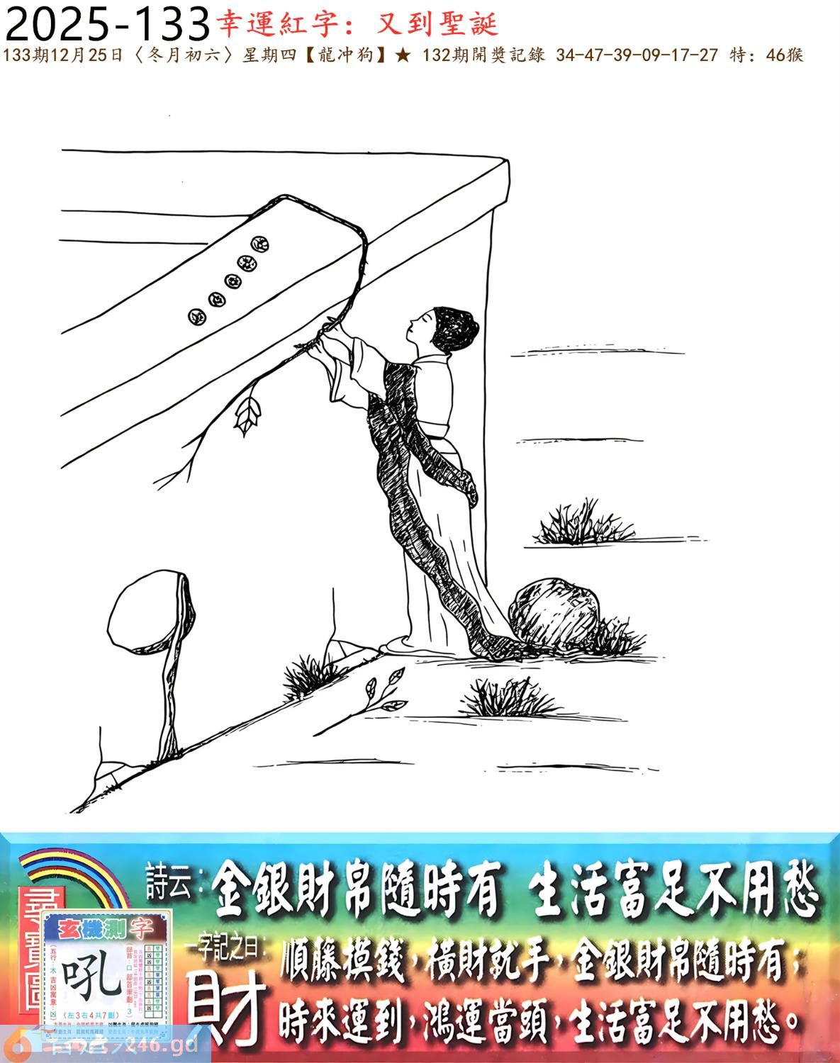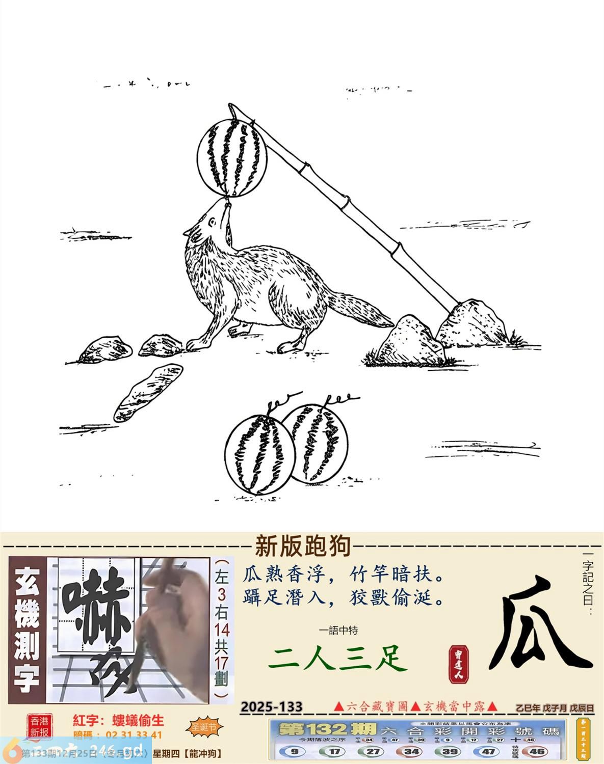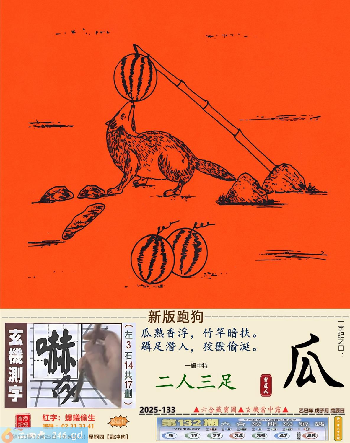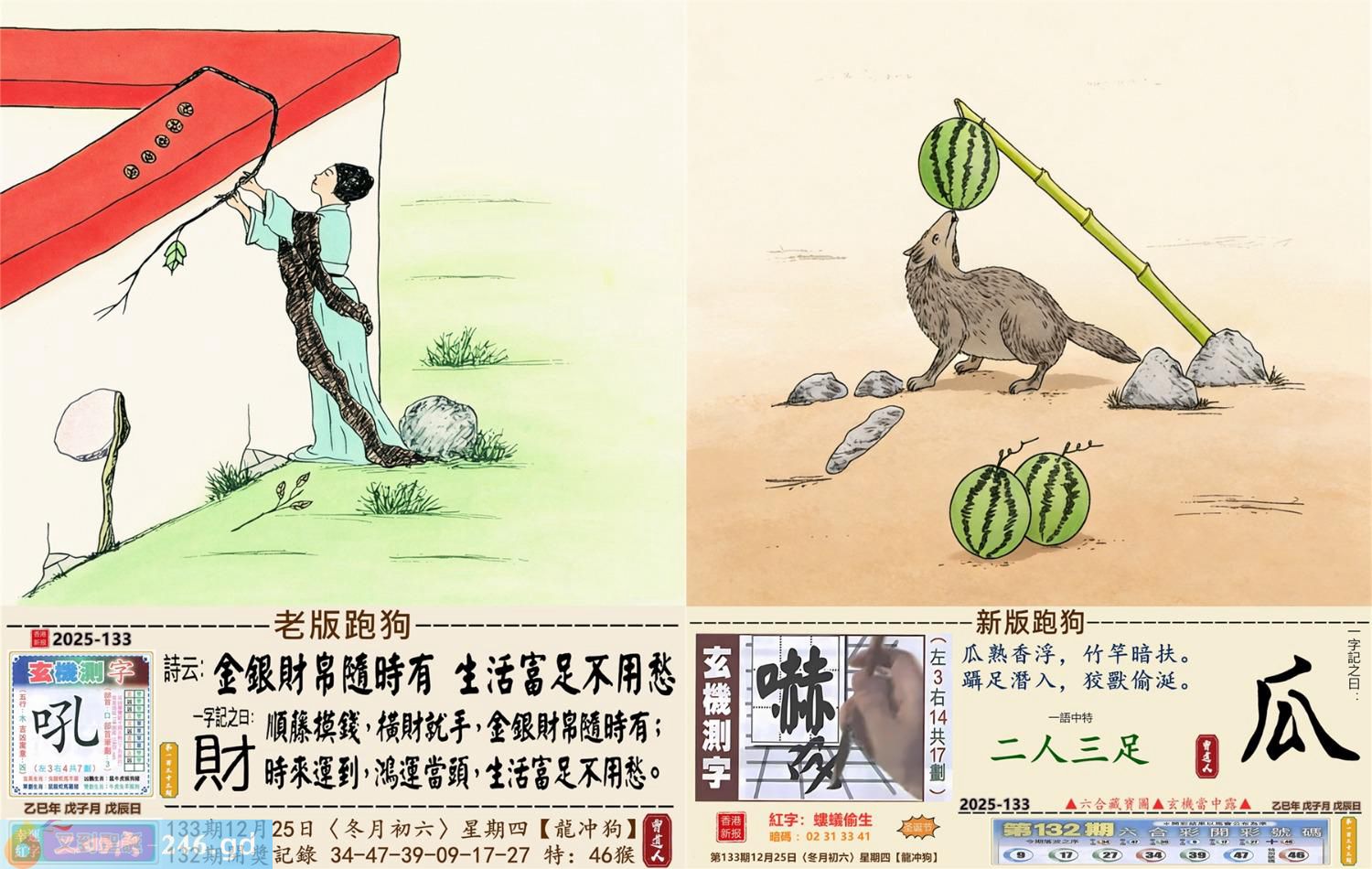 2025年12月25日133期狗(壬戌)(大林木) 133期:老版跑狗玄機一字記之曰:【財】 詩雲:金銀財帛隨時有生活富足不用愁 順藤摸錢,橫財就手,金銀財帛隨時有; 時來運到,鴻運當頭,生活富足不用愁。 玄機測字:《吼》 密圖詩:三個和尚沒水喝 《記》:一江春水向東流 特碼大小單雙句:八戒戲嫦娥 今期必中:張飛 133期:特碼歇后語 尿壶打掉把儿-----光剩一张嘴 133期正版四字梅花诗:高不可攀。 133期火车头:烧伤马。诗:龙死兔伤,四六分明把数算。 133期香港第一手欲钱料:牛。 133期曾道人说:“随遇而安?” 133期另版四字梅花诗:穷意识就。 133期香港第一手欲钱料:欲钱看西游记第二回。 133期曾道人说:“男人三十喝酒时喜欢做什么事”? 133期:二字經:看頭 133期:皇帝是特码 133期:智力金壤:一丘之貉 133期:信箱紅字:【螻蟻偷生】 133期:【暗碼:02-31-33-41】 133期:一語中特:【二人三足】 發財玄機圖:雄才大略氣慨威武圖中明龍紅綠 133期:藏寳圖 新:斗牛不神箕独灵 老:轻舸帷恐东下迟 禁:牛禁:0尾玄機字《弦》 2025年133期【生活幽默】版 〖在公厠裏〗 在公厕裏,忽然聽到間有人説話:"哥們兒,有手纸嗎?" 我翻了翻口袋:"抱歉,没有。" 過了幾秒鐘,那人又問:"那有小塊報纸嗎?"我無奈地一笑:"對不起,没有,我祗是來小便的。" 又過了幾秒鐘,間門縫塞出一張10元人民幣:"能幫我换成1塊錢的嗎?" 我把錢遞過去,間裏傅來一聲咆哮:"你别給我十個硬幣啊!"