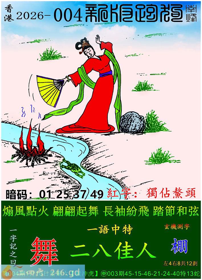 004期跑狗一字記之曰:【舞】 煽風點火,翩翩起舞。 長袖紛飛,踏節和弦。