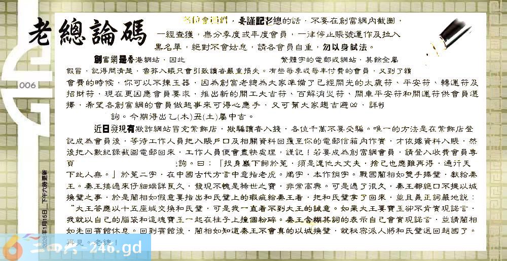 006期:六合皇金句/老总论码/萧公子/林大师/五行夺码/老总信箱截图