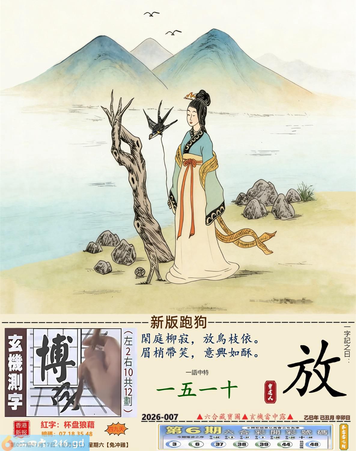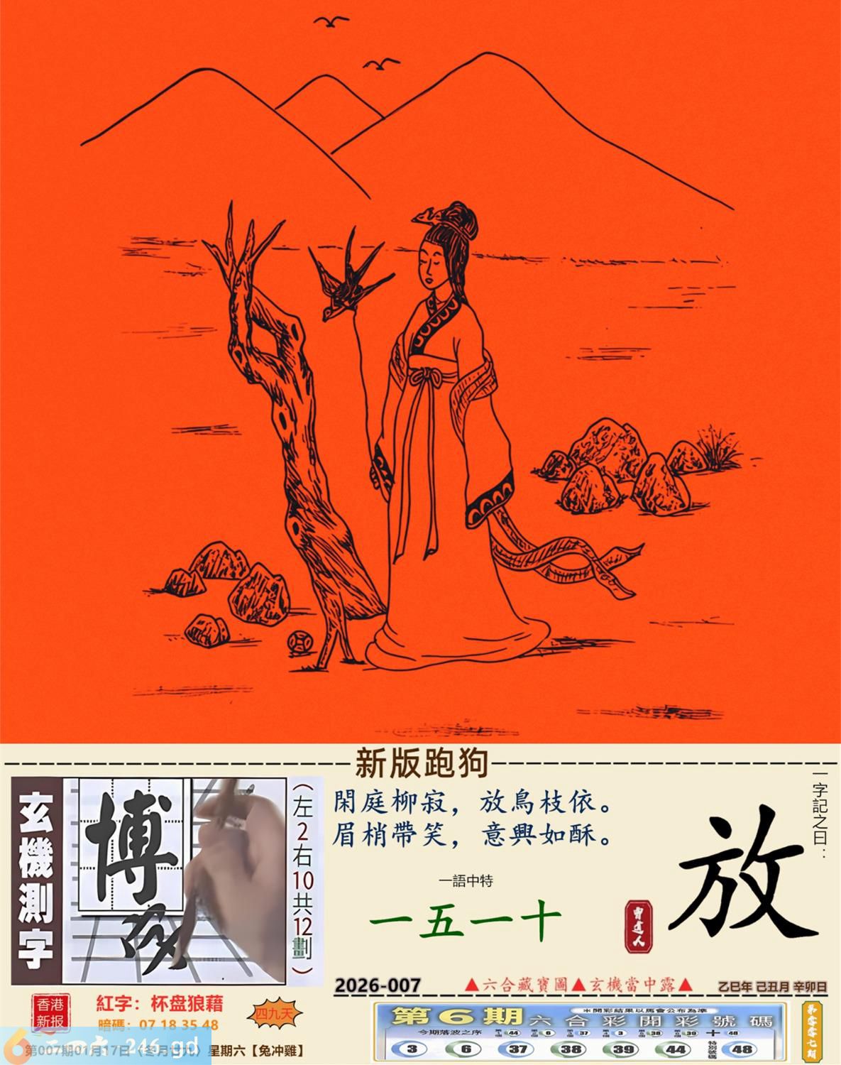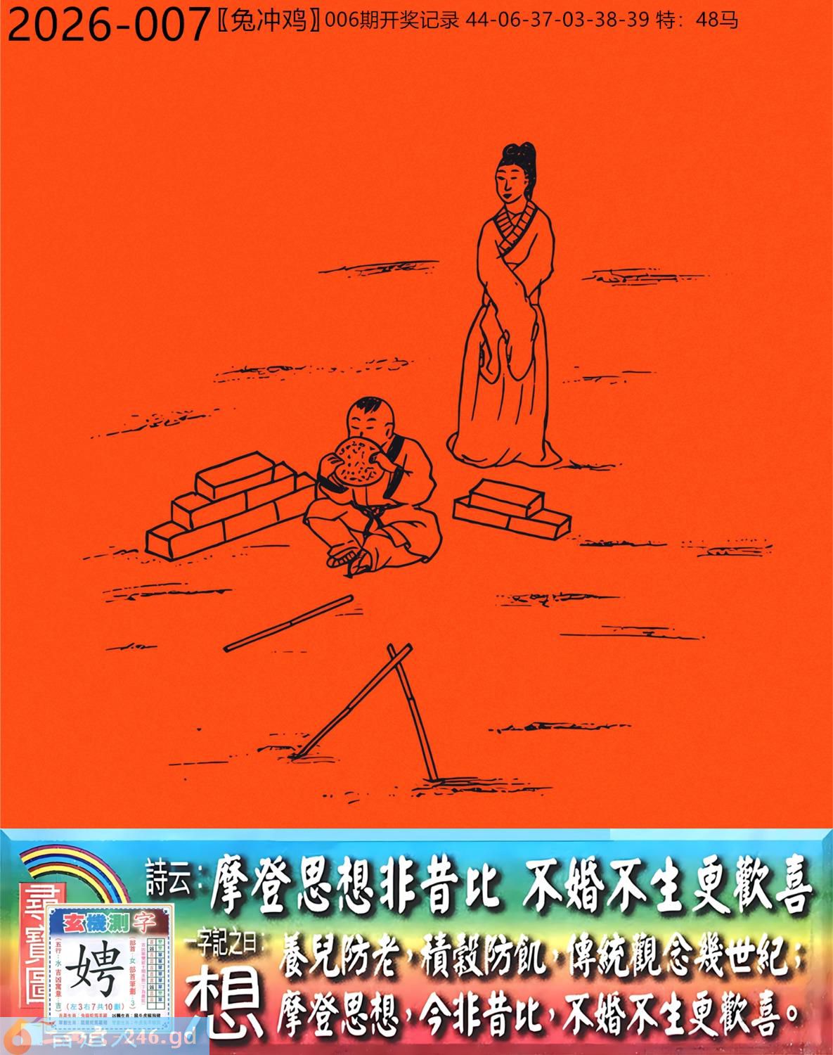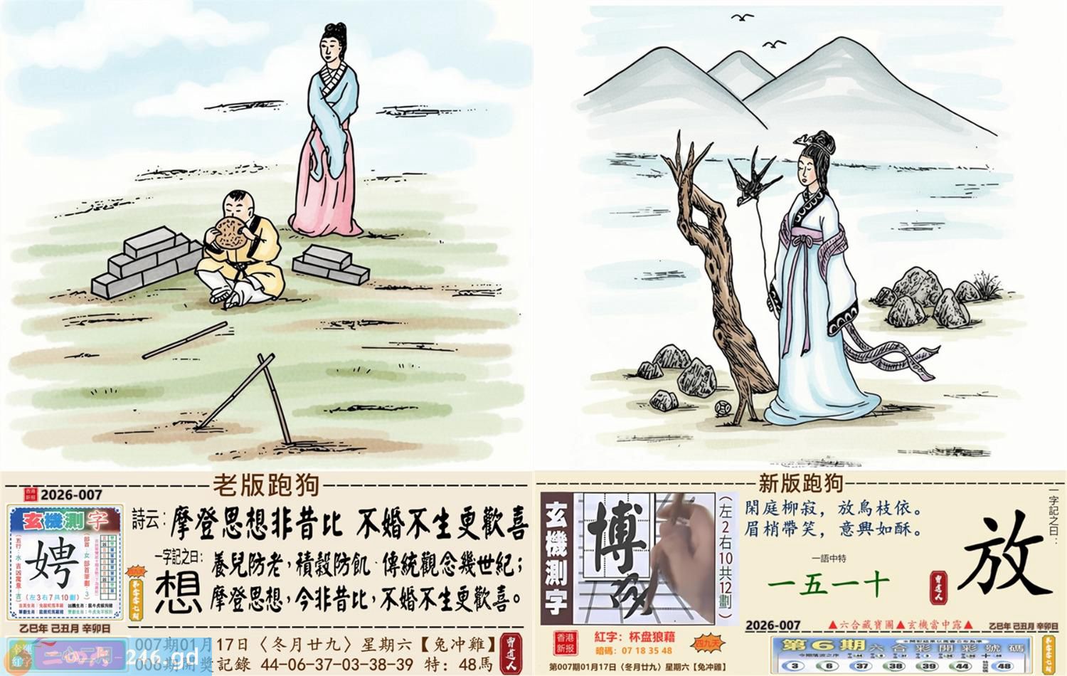 2026年1月17日007期鸡(乙酉)(松柏木) 007期:老版跑狗玄機一字記之曰:【想】 詩云:摩登思想非昔比不婚不生更歡喜 養兒防老,積榖防飢,傳統觀念幾世紀; 摩登思想,今非昔比,不婚不生更歡喜。 玄機測字:《娉》 密圖詩:左邊不是右邊是 《記》:山上拾柴烤兔子 特碼大小單雙句:一腳登天是神仙 今期必中:孫尚香 007期:特碼歇后語 混进狗群的狼-----藏头藏尾 0007期正版四字梅花诗:旗鼓相当。 007期火车头:烧伤兔。诗:虎死牛伤,一蛇延愿十里长。 007期香港第一手欲钱料:单?。 007期曾道人说:“双?” 007期另版四字梅花诗:三长两短。 007期香港第一手欲钱料:欲钱找中国茅台酒。 007期曾道人说:“为什么女人爱烫发”? 007期:二字經:七八 007期:狗官是特码 007期:智力金壤;庖丁解牛 007期:信箱紅字:【杯盘狼藉】 007期:【暗碼:01-18-20-41】 007期:一語中特:【一五一十】 發財玄機圖:歡蹦亂跳小巧玲瓏圖中明羊紅綠 007期:藏寳圖 新:已陪沁水追欢日 老:少小虽非投笔吏 禁:猪禁:2尾玄机字《空》 2026年007期【生活幽默】版 〖醉酒后〗 一般人在酒醉之後有的會酒後亂性,有的則會説出真心話...... 何先生在睡前喝一點酒之後,覺得頭腦發暈,先去睡覺。 睡到半夜何先生突然起床趕緊穿好襯衫,褲子。 "你半夜起床穿衣服幹嘛要去哪?"何太太莫名奇妙地間。 "我要趕快回家去。"何先生很本能地回答。
