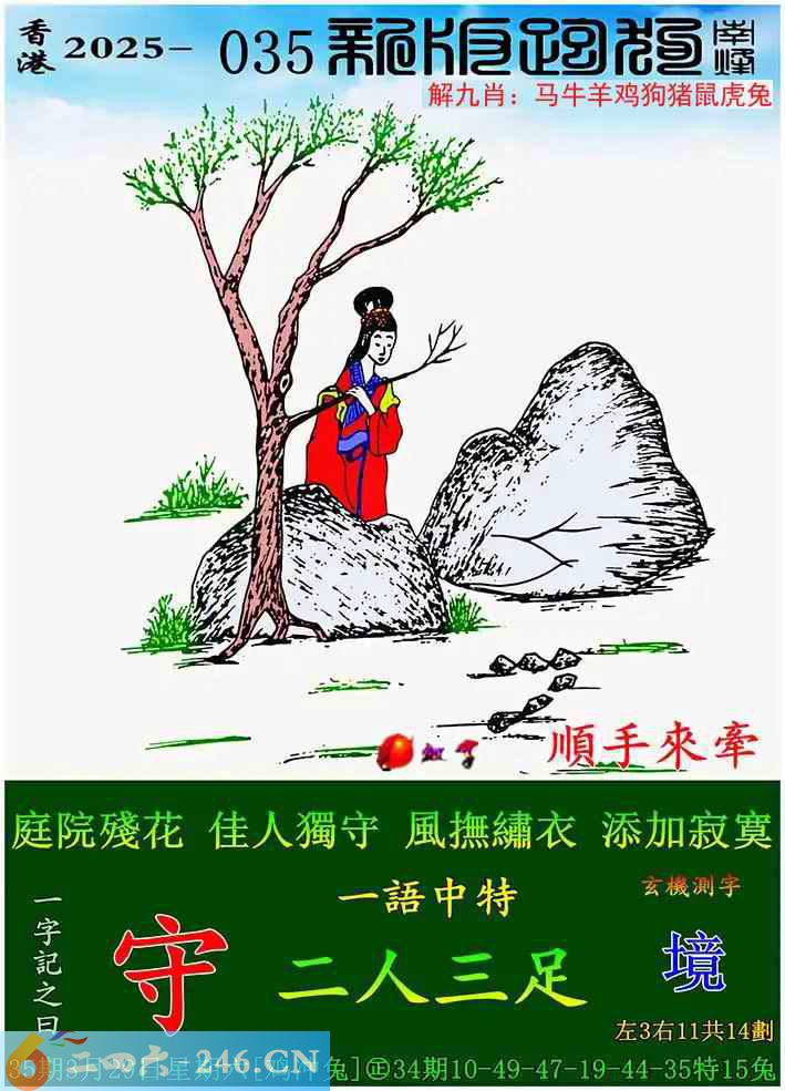 35期香港新版跑狗详解 图中有1棵大树跟2块大石头解12马,2块石头的中间站着1个红衣女子解21鸡,2块大石头解02龙。其中一块大石头上面有个5字型解05牛,下面的几个小石头组成7字型解07猪。地上一共有3株绿草解03兔,2块大石头跟3株绿草解23羊。 综上所解得出马鸡龙羊牛猪兔。 综合取肖:羊龙马鸡牛猪三肖:龙鸡猪一肖:猪 主:11,47,14,26,38,36,48,9,21,33,5,17,41,31,43