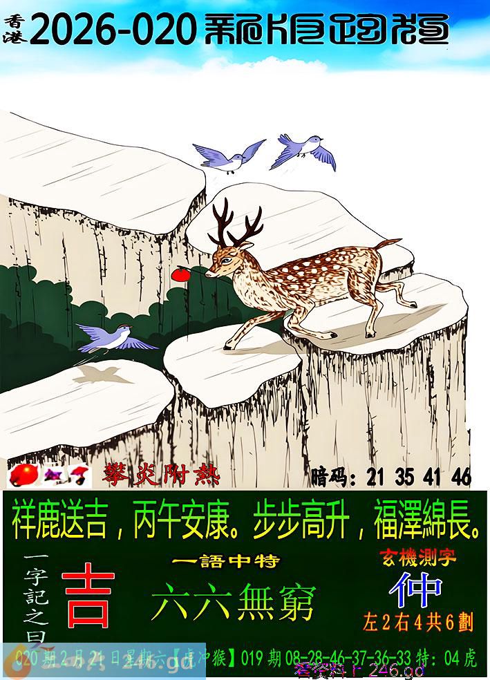 020期跑狗一字記之曰:【吉】 祥鹿送吉,丙午安康。 步步高升,福澤綿長。