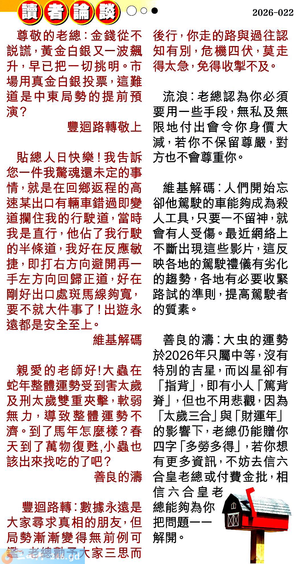 第022期讀者論談 1.尊敬的老總:金錢從不説謊,黃金白銀又一波飙升,早已把一切挑明。市場用真金白銀投票,這難道是中東局勢的提前預演?豐迴路轉敬上 〖豐迴路轉〗:數據永遠是大家尋求真相的朋友,但局勢漸漸變得無前例可鑑,老總勸予大家三思而後行,你走的路與過往認知有別,危機四伏,莫走得太急,免得收掣不及。 2.貼總人日快樂!我告訴您一件我驚魂還未定的事情,就是在回鄉返程的高速某出口有輛車錯過即變道欄住我的行駛道,當時我是直行,他佔了我行駛的半條道,我好在反應敏捷,即打右方向避開再一手左方向回歸正道,好在剛好出口處斑馬線夠寬,要不就大件事了!出遊永遠都是安全至上。維基解碼 〖維基解碼〗:人們開始忘卻他駕駛的車能夠成為殺人工具,只要一不留神,就會有人受傷。最近網絡上不斷出現這些影片,這反映各地的駕駛禮儀有劣化的趨勢,各地有必要收緊路試的準則,提高駕駛者的質素。 3.親愛的老師好!大蟲在蛇年整體運勢受到害太歲及刑太歲雙重夾撃,軟弱無力,導致整體運勢不濟。到了馬年怎麼樣?春天到了萬物復甦,小蟲也該出來找吃的了吧?善良的濤 〖善良的濤〗:大虫的運勢於2026年只屬中等,沒有特別的吉星,而凶星卻有「指背」,即有小人「篤背脊」,但也不用悲觀,因為「太歳三合」與「財運年」的影響下,老總仍能贈你四字「多勞多得」,若你想有更多資訊,不妨去信六合皇老總或付費金批,相信六合皇老總能夠為你把問题一一解開。 〖流浪〗:老總認為你必須要用一些手段,無私及無限地付出會令你身價大減,若你不保留尊嚴,對方也不會尊重你。