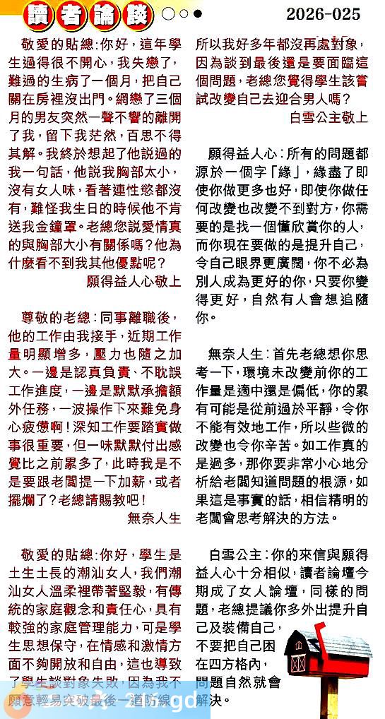〖白雪公主〗:你的來信與願得益人心十分相似,讀者論壇今期成了女人論壇,同樣的問題,老總提議你多外出提升自己及装備自己,不要把自己困在四方格内,問題自然就會解決。